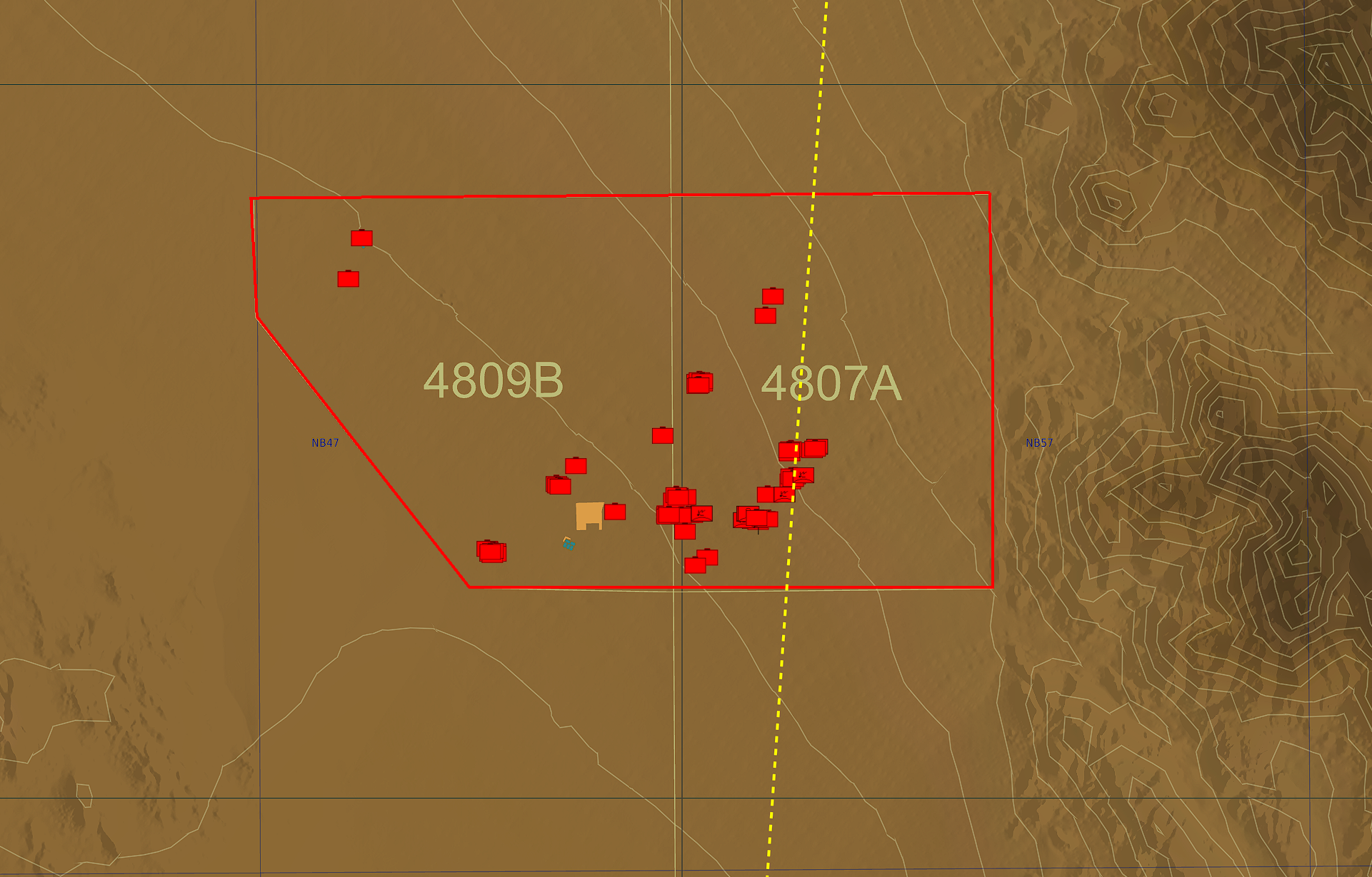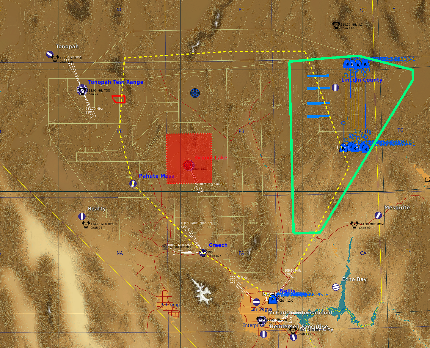 Décollage de Nellis AFB, WPT02 sur entrée de la zone AAR; WPT03/04 Marshall (du Nord au Sud de 01 à 04), puis les WPT suivants amènent vers les cibles en passant par le Nord (Zone "Reveille).