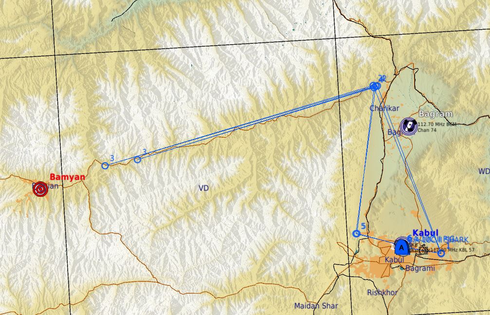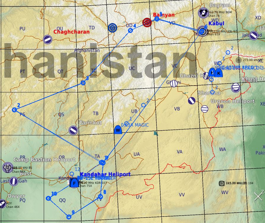 de Kandahar WP1 DEPART WP2 REJOINTE B1 WP3 PATTERN D'ATTENTE B1 REDUCTION SA2 WP4 IN WP5 TARGETS WP6 KABOUL WP7 ARRIVEE  Au départ de Kaboul WP1 DEPART WP2 TCHARICAR WP3 TARGETS WP4 TCHARICAR WP5 ARRIVEE  Zone de strike  Menaces :