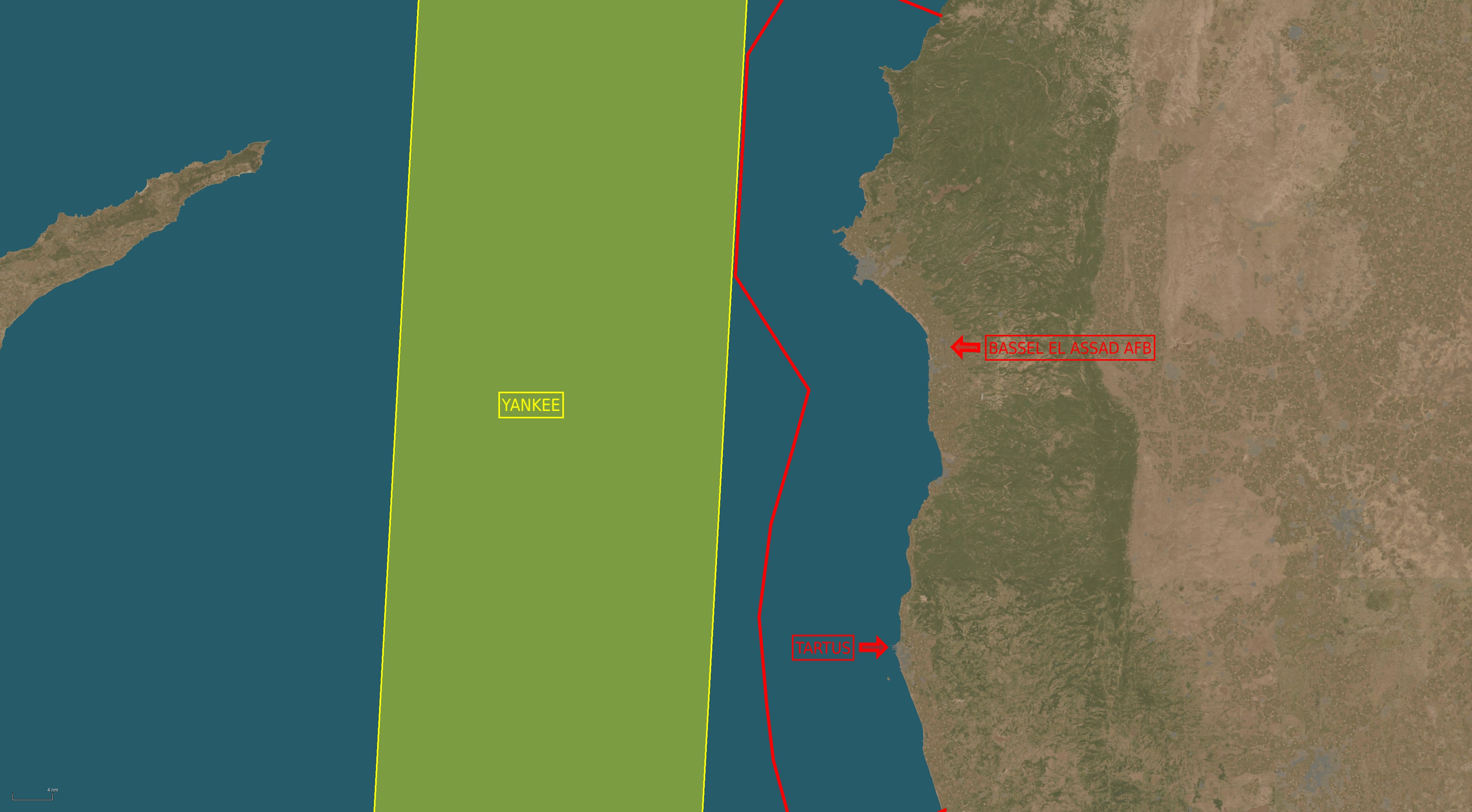 Bien que la Syrie et son allié russe ne soient pas ciblés sur cette mission, il y a fort a parier qu’ils ne nous laisseront pas tranquille surtout quand nous devrons pénétrer dans leur espace aériens pour détruire les vedettes rapides et la cargaison sur la plage. Attention aux défenses anti-aériennes (SA-6, SA-19) et à la chasse russe (Su-33) et syrienne (Mig 21, Mig 23, Mig 29).  Les zones de dangers sont le port de Tartus qui est controlé par les russes et où se trouvent des SA-6 et SA-19 d'aprés nos dernières infos et l'aéroport de Bassel-El-Assad ou sont stationnés les SU-33 russes, ainsi que des SAM type SA-19.  Attention il y a beaucoup de navires marchands dans la zone. Pas de bavure. Autres informations :