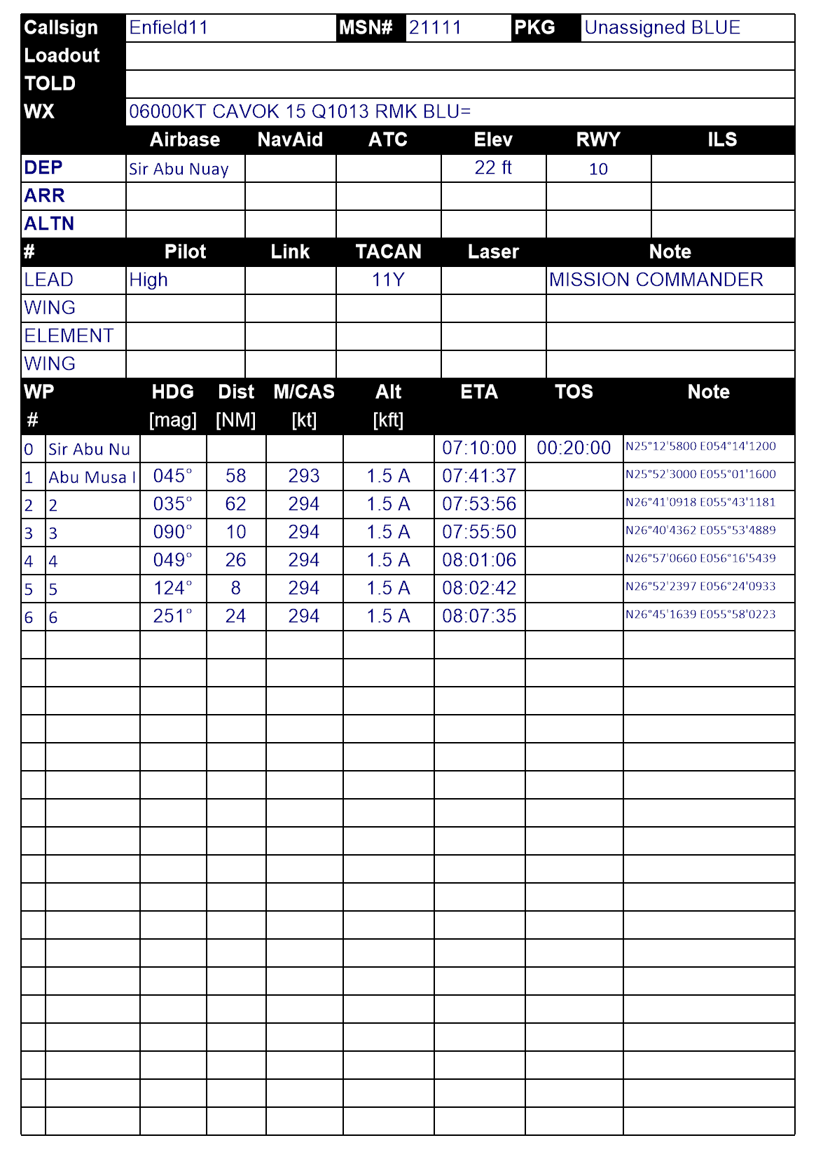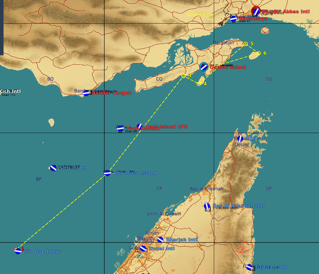Carte Persian-Gulf, Template 3rd, No Mods, tout le monde est bienvenu. (Pas de Splash Damage) Missio posée sur le serveur et testée OK. Fq commune : OVERLORD Marines : Marines 1 et Marines 2 21 janvier, 15°C, QNH 760 Météo : temps clair, léger brouillard, se lève rapidement. (Preset High scattered1) Les appareils des différentes forces aéronavales décollent de leurs navires respectifs. Les appareils non-embarqués (les pauvres) décollent d'Al Minhab AFB. OMAN a accepté de nous ouvrir son espace aérien, nous y avons donc mis les Tankers, et KHASAB est un terrain possible en déroutement. Respawn, éjection, autre : Dynamic Spawn Slots disponibles sur Rais Al Khaimah (possibilité de décollage HOT, attention, passez en gestion radio manuelle, vous perdez les presets 3rd).Sus aux Pirates ! La région de QUESHM est devenue l'épicentre de la piraterie maritime depuis quelques années. Notre QG a décidé de frapper un grand coup en "traitant" le problème à la base. Les forces embarquées traiteront les objectifs de l'Ouest et du Sud Ouest. WPT03 & 04. Les forces non-embarquées (les pauvres), traiteront les objectifs de l'Est et du Sud Est.... WPT05 & 06. (pensez à explorer les îles sur lesquelles sont les systèmes Silkworm pour trouver les QG et camps des ennemis) Si vous en avez terminé avec ces objectifs, vous pouvez aller "aplatir" la cible sur le WPT07... Bon vol, bonne chasse ! OBJECTIFS ET ROUTE WPT01 Sir Abu Nuayr WPT02 Abu Musa Island WPT03 Atelier de drones marins de Salakh (Queshm Island) WPT04 Silkworm à détruire (Et HQ au nord de l'îlot) WPT05 Atelier de drones marins de Baharestan (Queshm Island) WPT06 Silkworm à détruire (Et HQ à proximité) WPT07 Camp de formation des Insurgés  La route est identique pour tout le monde, pensez à récupérer le fichier ! Il s'utilise avec l'outil Routetool de DCS, au choix de coalition, il suffit de le sélectionner en preset et de cocher la case pour l'utiliser au prochain spawn... (n'hésitez pas à me demander, je ré-expliquerai).