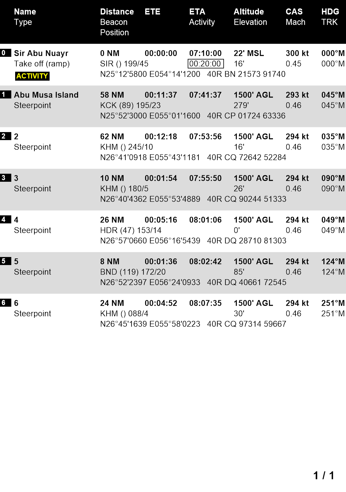 Départ NELLIS AB 03R, DREAM07 CHECK IN DREAM TARGETS Coordonnées transmises au brief mission 1 passe dive 1 passe loft 1 passe canon CHECK OUT RAVITO 2000 livres Arrivée ILS 21L ZAPVO BREAK PARKING Menaces :