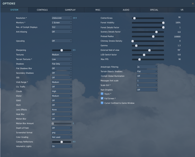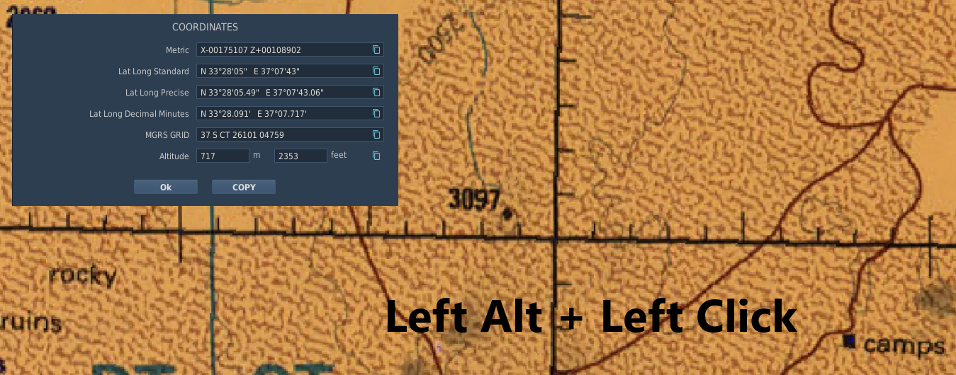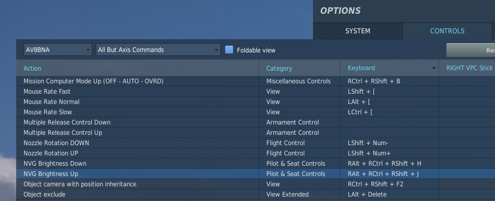 Dans les éléments utiles pour la mission, concernant le confort du vol. Pensez pour ceux qui utilisent les NVG à "mapper" ceci (Up & Down):  Pour le vol nocture en général, pensez à régler l'option "Gamma" (rien à voir avec la lessive...) je vole à 2+ en nocturne :  Pour les pilotes de Harrier, une option fondamentale, qui vous permettra d'importer les cibles que vous avez créées comme celles qui peuvent vous être transmises... :  Pour tout le monde, si vous souhaitez un relevé rapide de coordonnées 'par exemple sous votre mulot), utilisez le coordinates picker, une option très pratique, intégrée à DCS et qui s'appelle via Left Alt + Mouse Left Click  Avions disponibles: