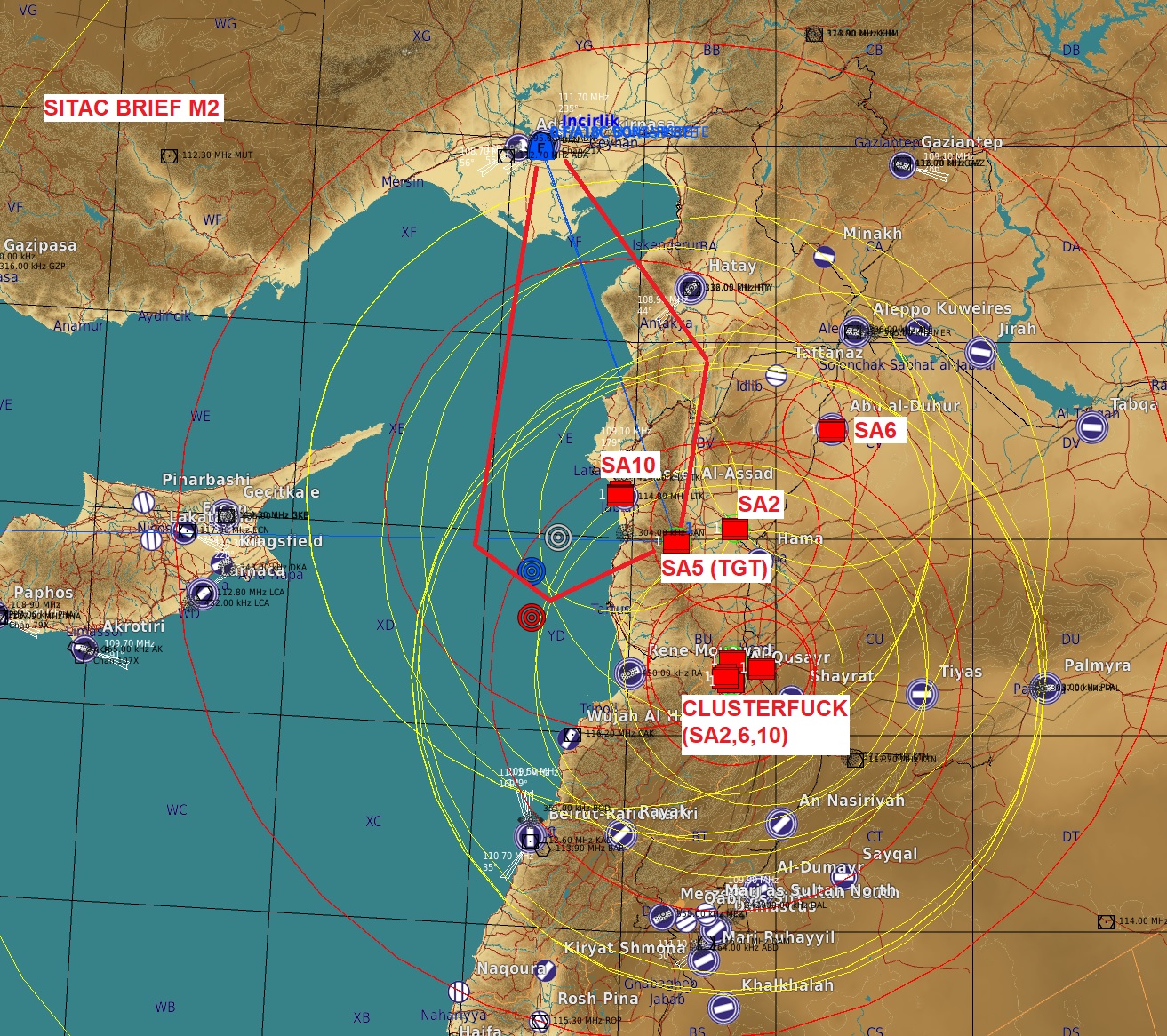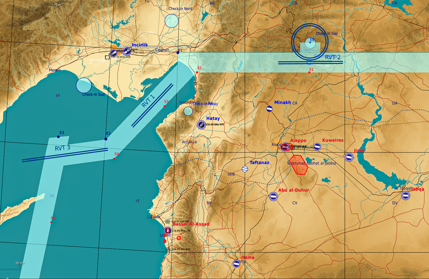 A remplir sur l' ATODoit comprendre: -un point check-in (incirlik: check-in nord, gazantiep: check-in gaz, minakh: nord aerodrome pour 5km), -un point d'entrée dans la zone de transit (noté E + 1 chiffre), -un point de sortie de la zone de transit (noté S + 1 chiffre), -un point ravitailleur (appareil capable), -un point Bullseye (optionnel). -D'autres points peuvent être indiqués mais ils devront être rentrés à la main pour les appareils capable. Carte de préparation Mission 3Menaces :
