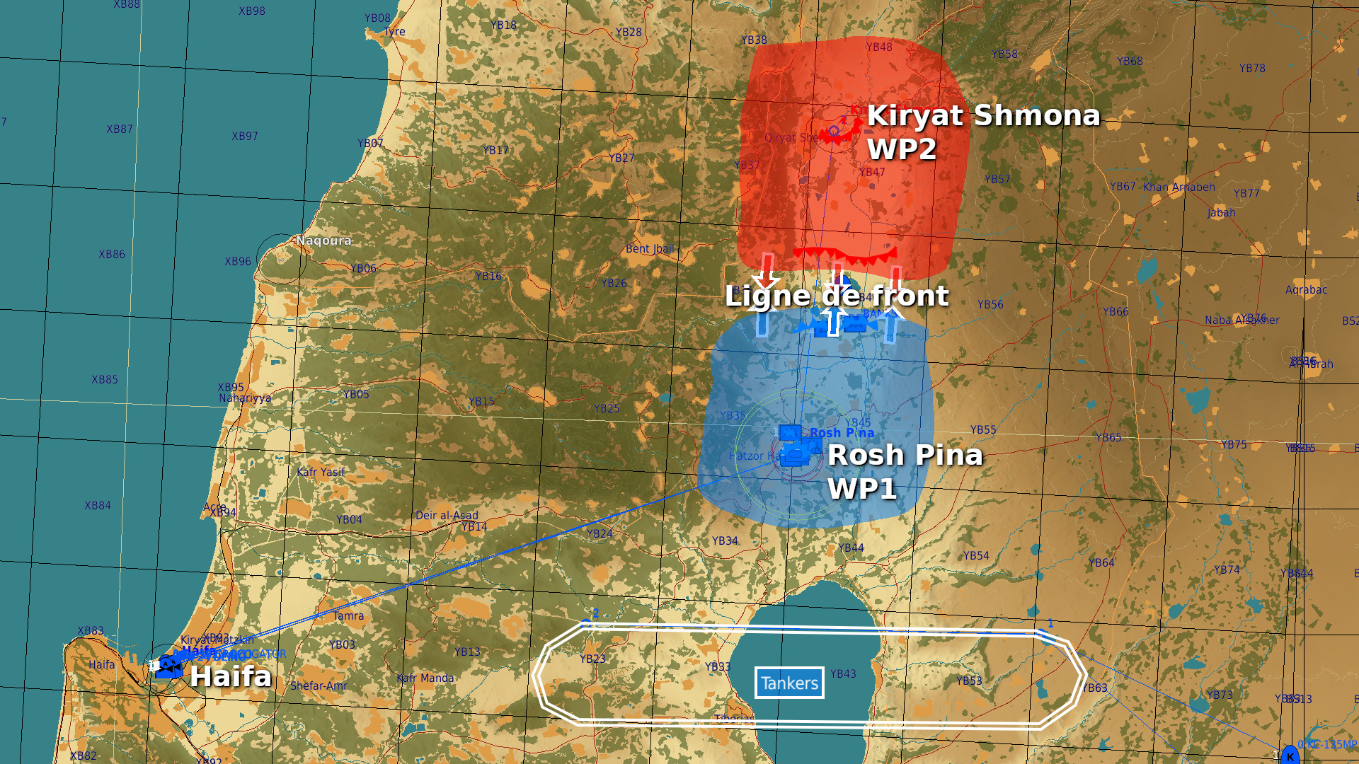 Départ : Haifa (hélicos) ou Ramat David (chasseurs) WP1 : Rosh Pina. Possibilité de refuel/rearm pour les hélicos. WP2 : Kiryat Shmona. Menaces :