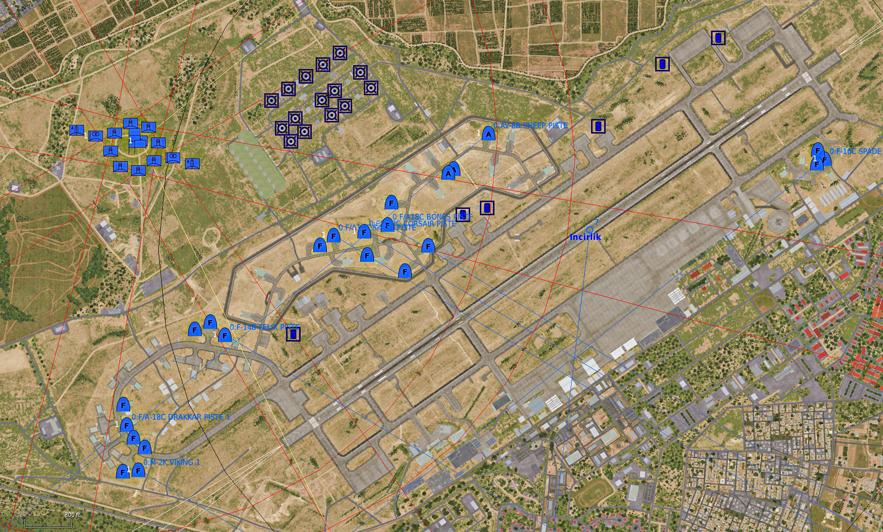 6 Octobre 2007 15h00 Loc Soleil: 6h40 - 18h10 Loc Météo: LTAG 061230Z 15208KT 9999 SCT/BKN 180 FEW 360 22/04 Q1024 Bullseye: N361050 - E0371327 (Piste de l’aéroport d'Alep) Aérodrome de déroutement et réarmement: Gazantiep / Hatay (ne pas utiliser les places de spawn). Comms Commune (sans contrôleur): Magic Commune AA: Magic Commune AS: Overlord AFAC Ouest: JTAC B/U #1 (Chevy 91) AFAC est: JTAC B/U #2 (Uzi 81) Ravitailleurs RVT1: ARCO 3 + Shell 1 RVT3: ARCO 1 + TEXACO 1 Parking patrouilles sur Incirlik:  Avions disponibles: