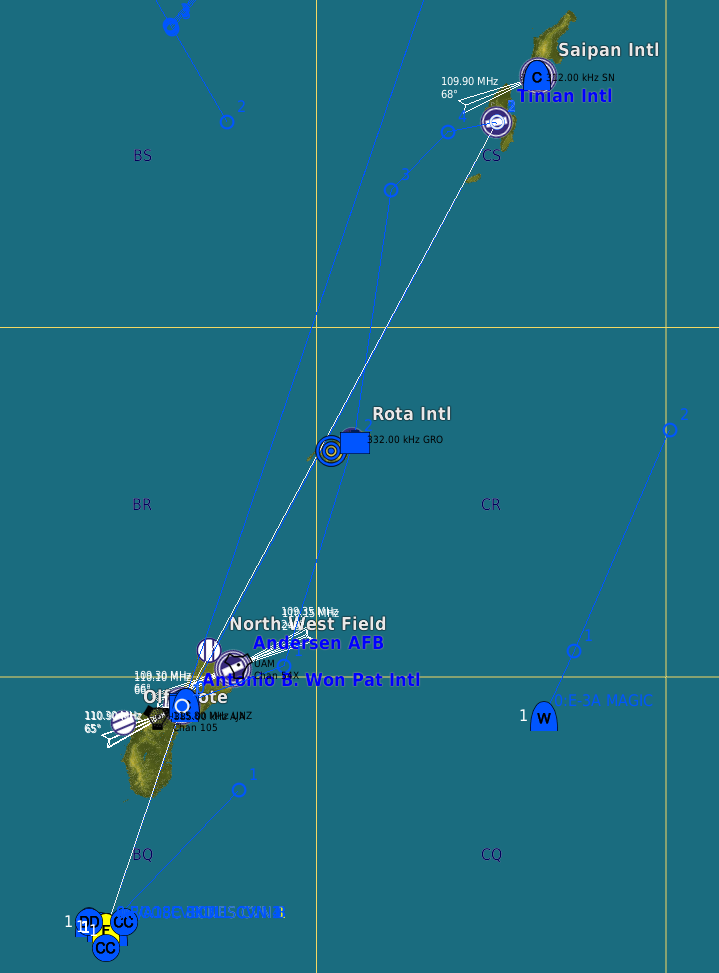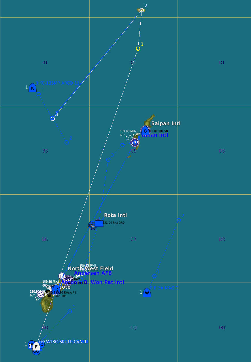 Pour les Bones, vous avez pour mission d'escorter un C-17, indicatif Globe, jusqu'à Tinian International (ATC#2) pour une livraison de matériels. Une fois arrivé sur zone, vous ferez demi-tour et reviendrez vous posez sur le Roosevelt. Vous avez un WP1 sur la base d'Antonio B. Won Pat Intl (ATC#1) pour vous poser et redécoller avec le C-17, puis un WP2 sur l'île de Tinian. ETD du Roosevelt 06:10, ETD Won Pat 06:30, ETA Tinian 07:00.   Pour les Skulls, un dernier exercice de tir de Maverick est prévu aujourd'hui. Chacun aura à tirer 4 Mavericks (2 IR et 2 Laser). Le champ de tir se situe sur l'île d'Anatahan (WP2) et vous disposez du WP1 à l'IP. Un KC-135 (Arco-1) sera en place autour du WP3. ETD du Roosevelt 06:15, ETA sur zone 07:00.    ATC#1 : Antonio B. Won Pat Intl ATC#2 : Tiinian Intl ATC#3 : Saipan Intl ATC#4 : Rota Intl ATC#5 : Andersen AFB Menaces :