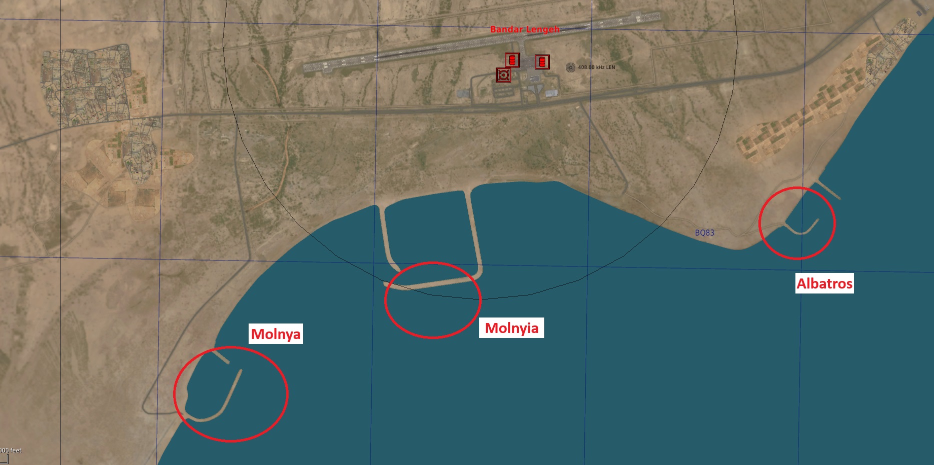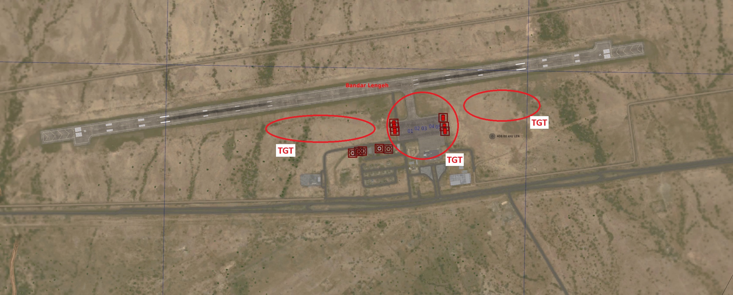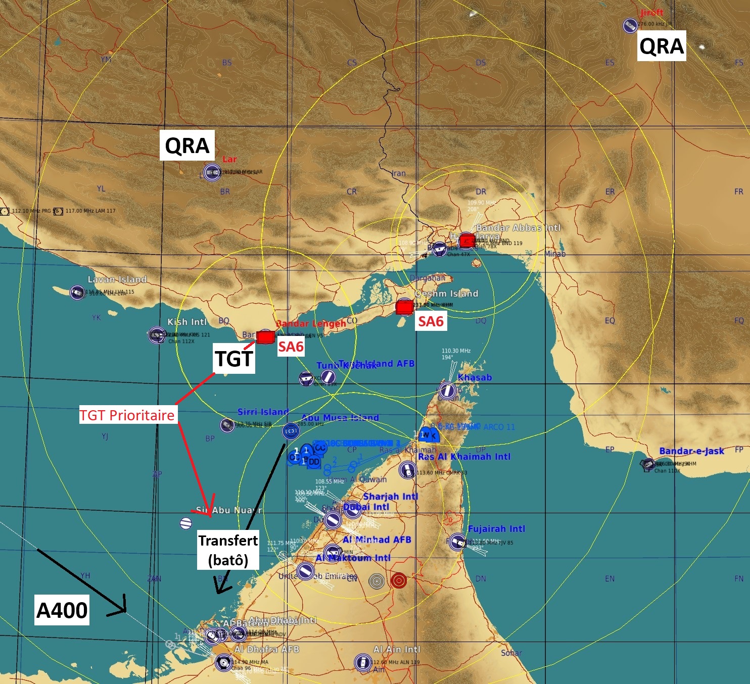 Prioritaire: Convoi déjà en mer composé de Molnyia&Albatros. Secondaire: Bandar Lengeth - Port : détruire les navires militaires: 3 Molnyias & 1 Albatros - Aéroport: détruire les appareils militaires et/ou du terrain: quantité de bomber & hélicos pas chers Pas de photo de reco à cause de la météo. Les positions supposées :   Note1: Aucun civil sur zone, pas de tri à faire. Note2: Une CAP de Mig29 est en place au dessus de la TGT. Plan de vol :