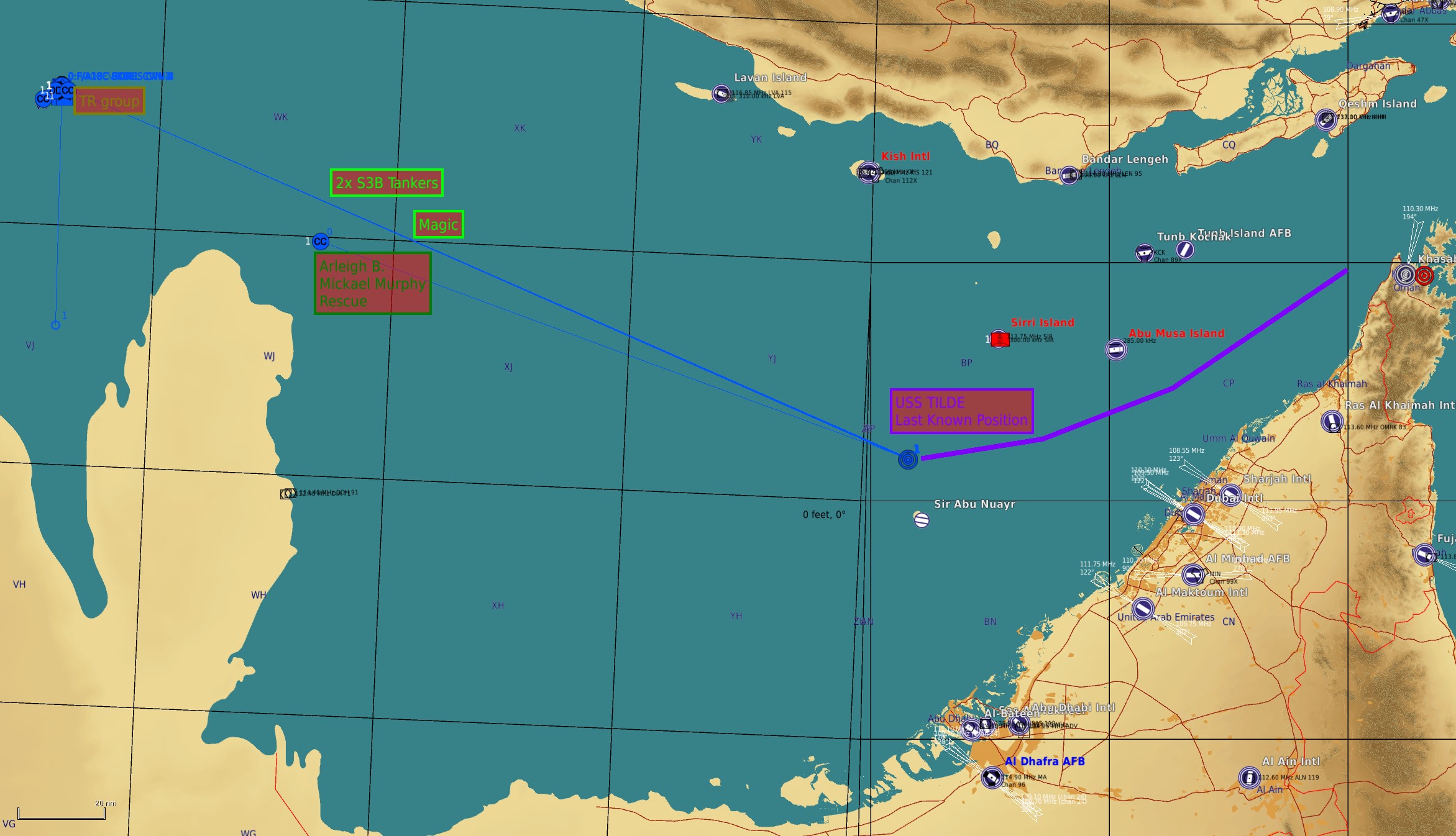Gentlemens, Ce matin à 11h35: Nous avons perdu le contact radio avec l'USS TILDE qui devait nous ravitailler en Kéro mais surtout en bière et côtes de boeuf pour fêter notre victoire sur FAROW ! Il n'etait plus qu'a 200 Nautiques, les cuistos avaient déja préparé la braise c'est une catastrophe ! LAST KNOWN POSITION :200 Nm EAST du TR 10 Nm north Sid Abu Nuayr , neutre N 25° 26' 42". E 54° 10' 19" Notre Intell a appri que la branche Aero du groupe WAGNER a été sollicitée par les iraniens pour se venger de notre attaque d'hier soir... je me demande ce que ces mercenaires pourraient engager comme unités... Emport Air/Air, vos avions sont prets, j'ai fait libérer les 4 cata, go, décollage en 5' svp, j'ai un mauvais préssentiment  Le destroyer USS Michael Murphy (DDG-112) de classe Arleigh Burke est dépéché sur place, votre mission est d'aller vous renseigner en avance de phase. Vous faites un tour puis vous rentrez. Hop prévu pour 1h-1h30 de vol maxi, l' USS Michael Murphy prendra le relai. Objectifs / Groupes / Désignations de cibles :