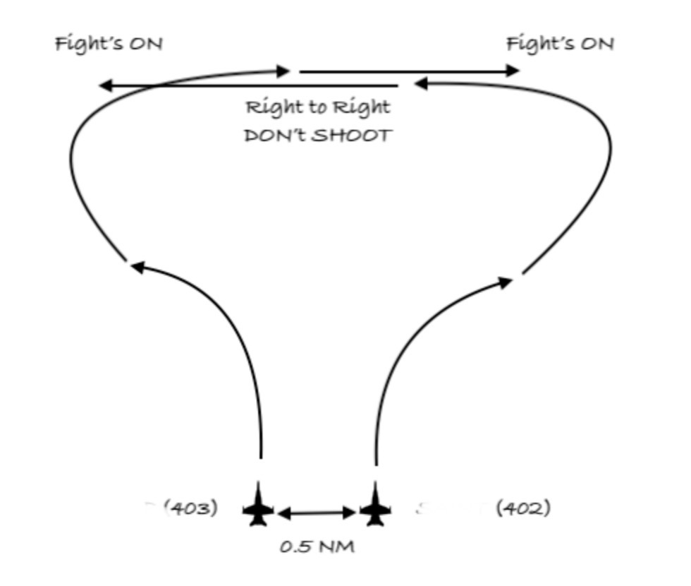 On se split, on se merge sans tirer en right to right, et seulement APRES on cherche l'autre. Décidez avant le fights ON si vous faites du AIM9 ou du canon simulé. J'insiste sur SIM... on a vu des gus qui on laché des obus... si c'est pour me faire après le coup du 'jai glissé chef', vous allez prendre cher ! Enfin, on annonce à la radio les hits emport: