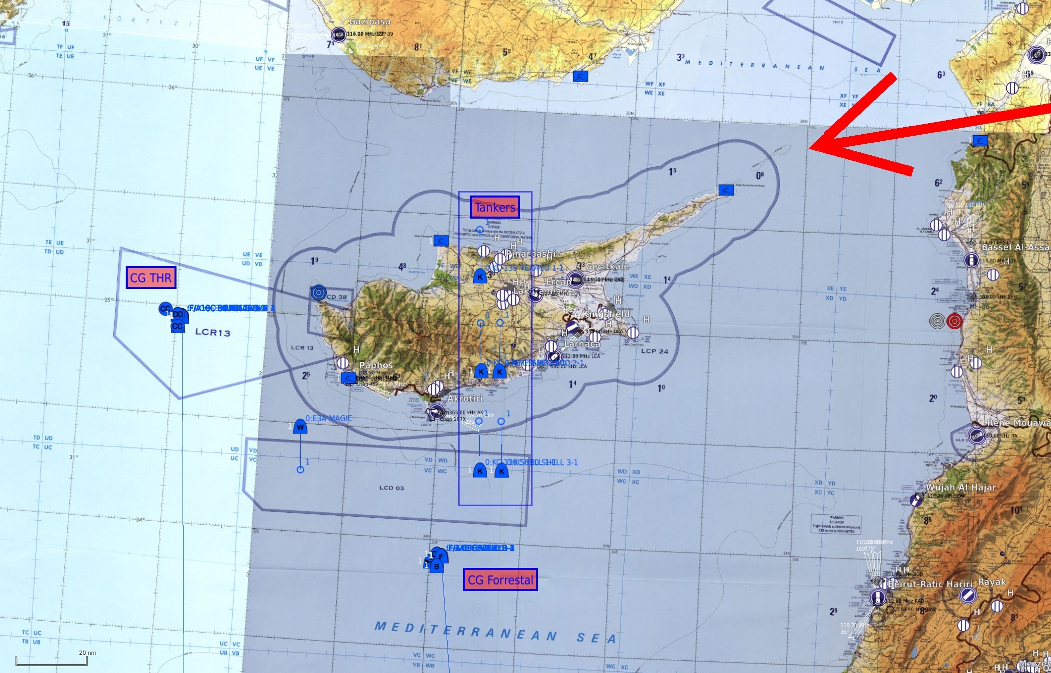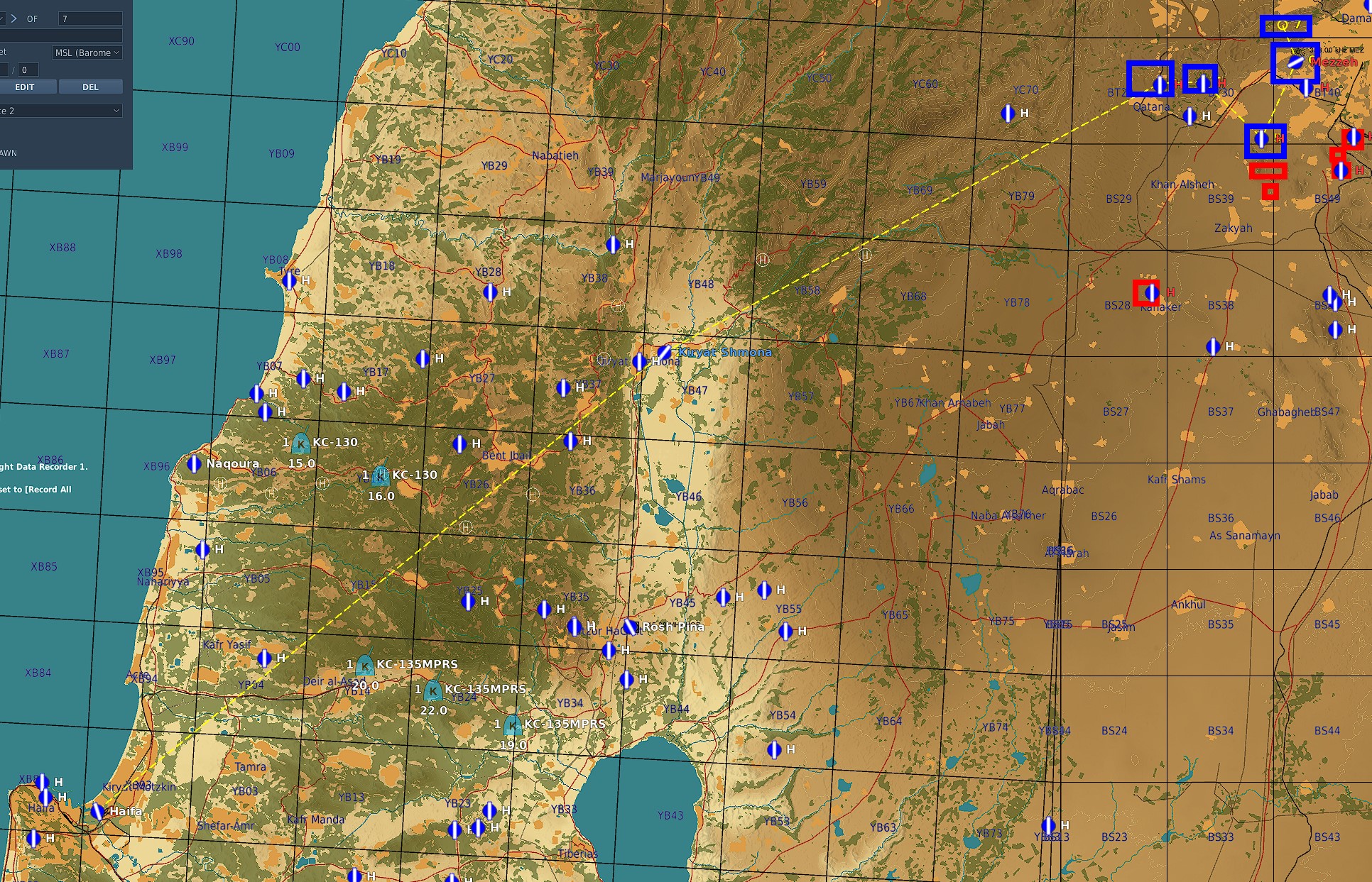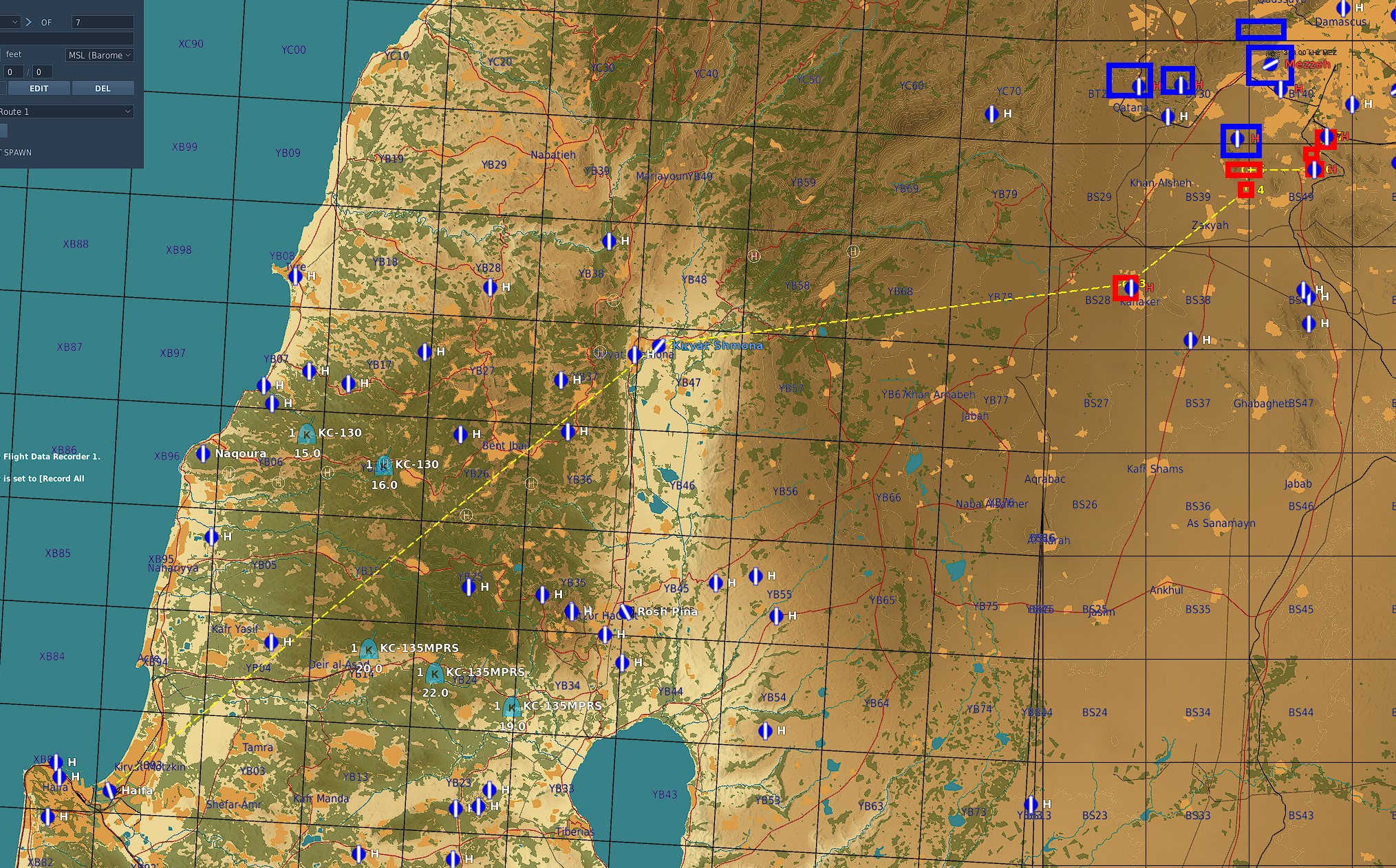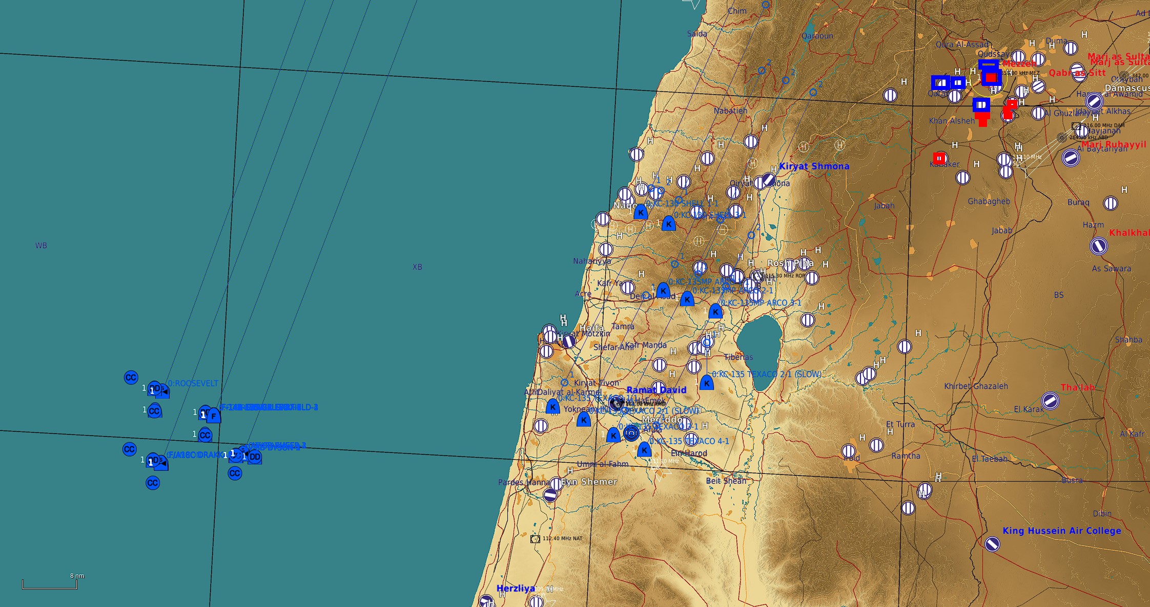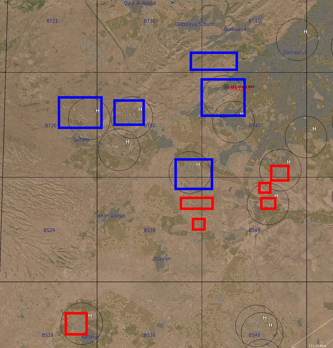 Carte SYRIE vol découverte FACO !!! Un coup d'État destabilise la région de Damas et d'anciens militaires veulent s'emparer de matériel. Nous somme dépêchés pour les en empêcher ! Leçon de démocratie explosive. Toutes bombes guidées Laser ou GPS de courte portée. Beaucoup de AAA, Sites SA-8 et SA-15, pas de Manpads connus. Entrée Haïfa, verticale Kiryat Shmona, puis cibles. On peut se poser sur les bases bleues, et si on se fait descendre, on peut revenir en "Hot Spawn". Attention, les zones de cibles sont proches, donc pensez aux coordinations sur la fréquence OVERLORD Les Marines, 2 patrouilles SHEEP, une patrouille DYSON, 2 TARAWAs. Sheep Marines1 & 2, Dyson Marines3. Sur le Pont et pour coordination Marines ATC2. Les autres : Fréquences autonomes...    Plan de vol :