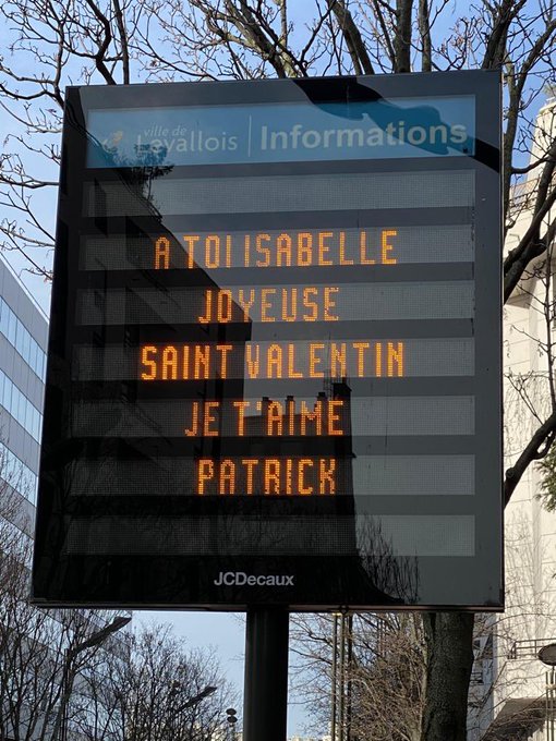 Pour la Saint-Valentin 2021, Patrick (Patoch, pour les intimes), a déclaré son amour à Isabelle (Bella, pour les intimes) à travers une magnifique déclaration sur un, lui aussi magnifique, panneau de JCDécoration.