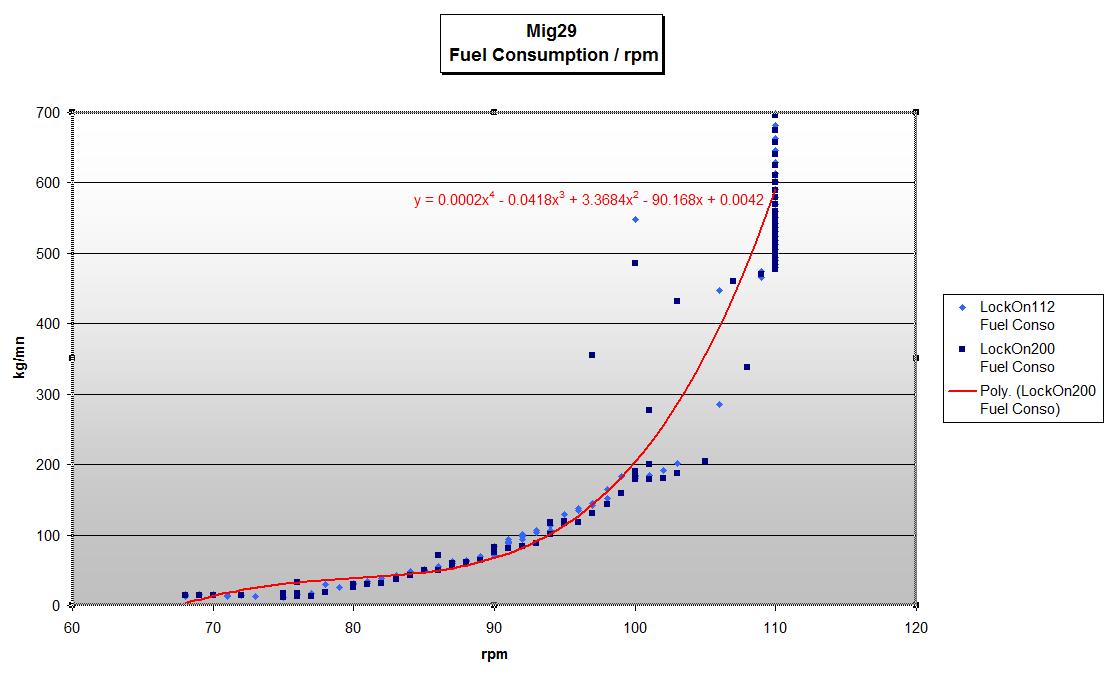 Nombre de téléchargements: 992On arrive donc à un graph du type Sur cette expérience, j'ai effectué des décollages en config lisse de Sochi. Buster et Gate en restant en radada. On voit donc que la PC du Mig pousse comme dans le 112, mais que la trainée doit être légèrement inférieure (Vmax supérieure dans LO200) , par contre en buster l'accélération est nettement moins forte, par contre la plus faible trainée permet de nouveau d'atteindre une Vmax supérieure. Ce qu'avec Pouka et Oslo on avait déjà pressenti lors de notre dernier vol Edit du 12/04, modification des exports pour donner aussi les valeurs de consommation Modification de la feuille Excel pour obtenir le graph conso et la régression Apparemment les consommations n'ont pas été modifiées entre LO112 et LO200. --------------------------------------------------------------------------------------------------------- Voici donc ces deux petits utilitaires : Pour Flaming Cliffs 112 :