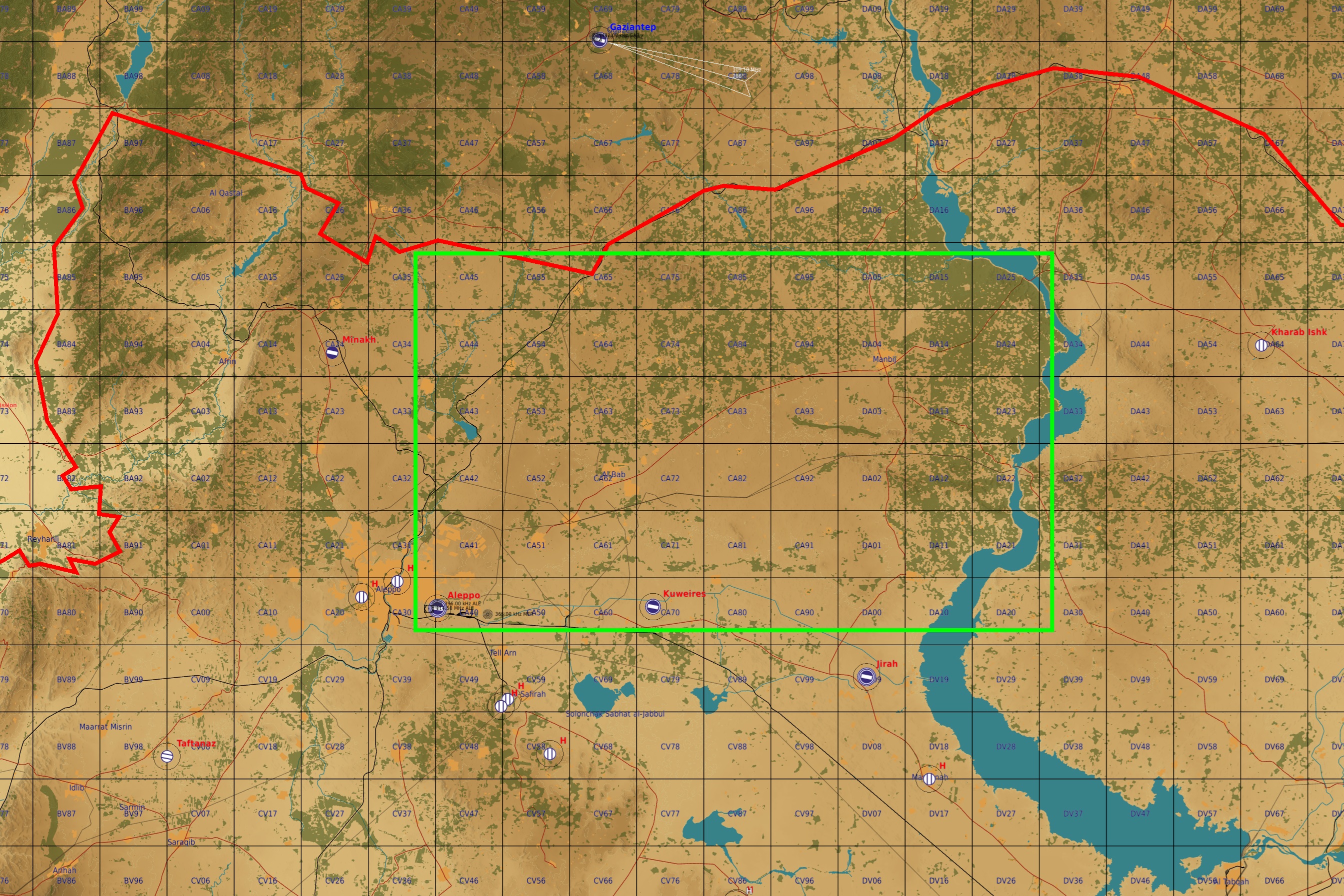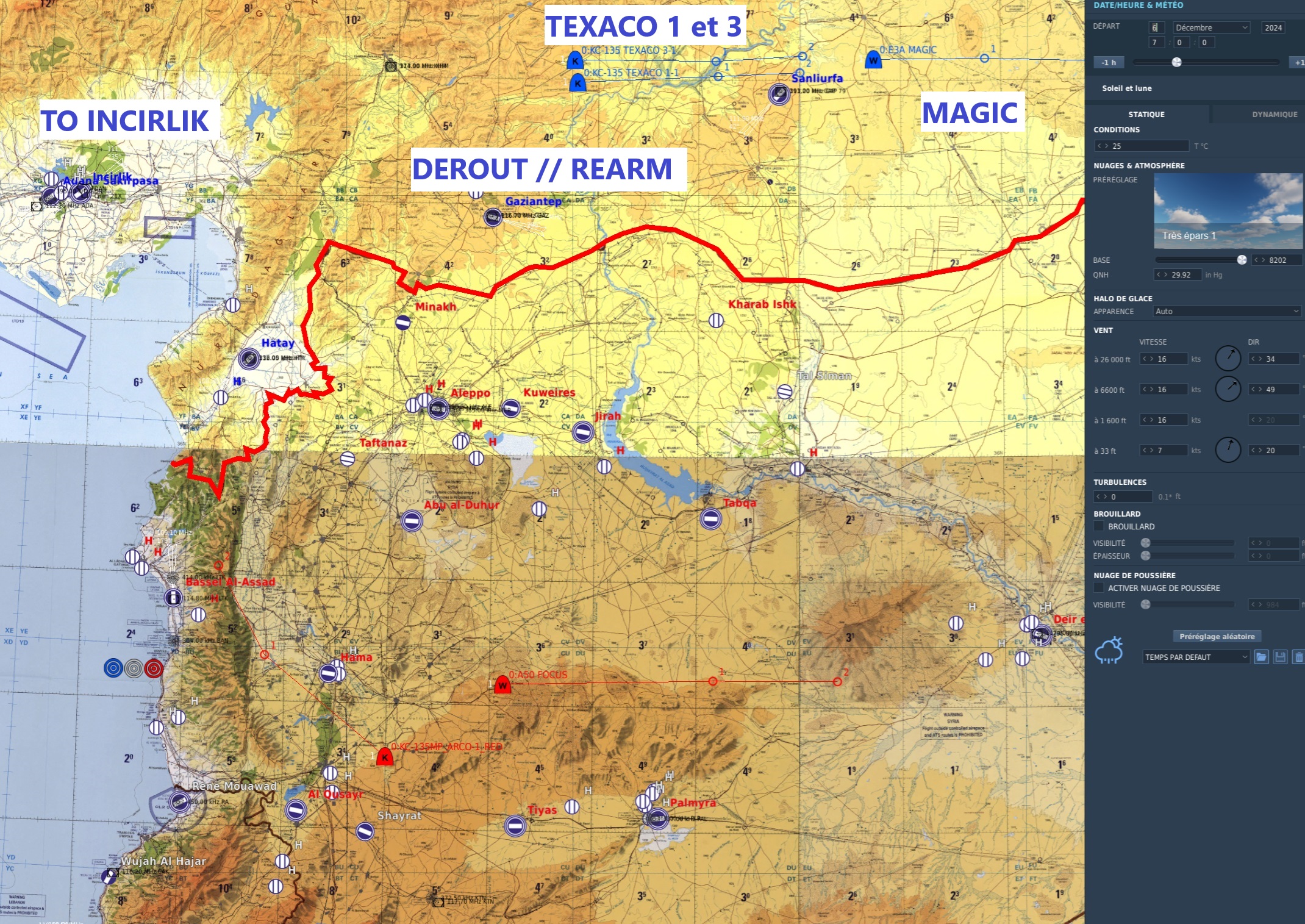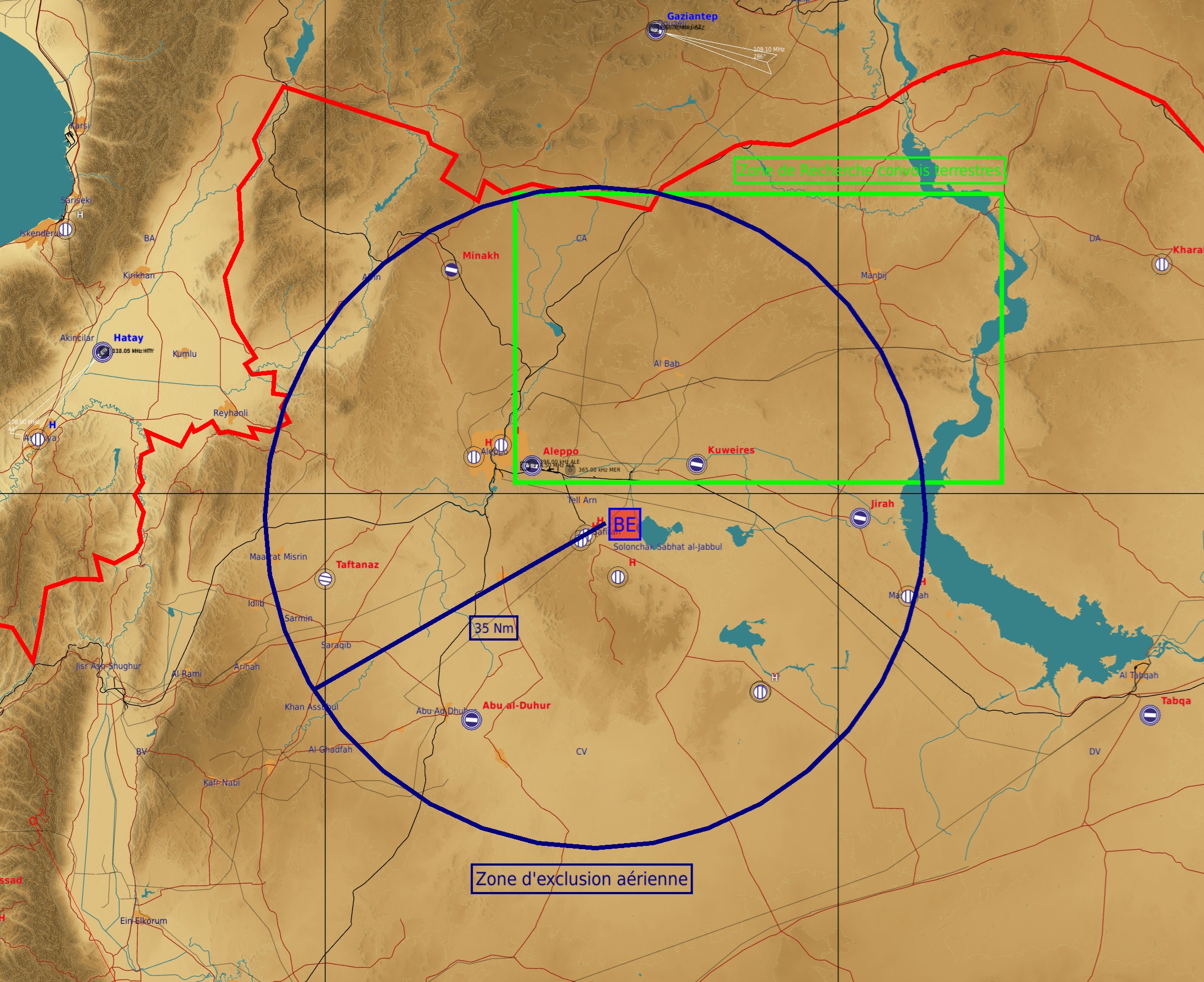 TASK MUDRecherche et destruction des convois terrestres des Rebelles en route vers Alep. Zone Recherche en vert. TASK CHASSEMaintient de la zone d'exlusion aérienne autour d'Alep. Zone exclusion aérienne en bleu. SITAC Plan de vol :