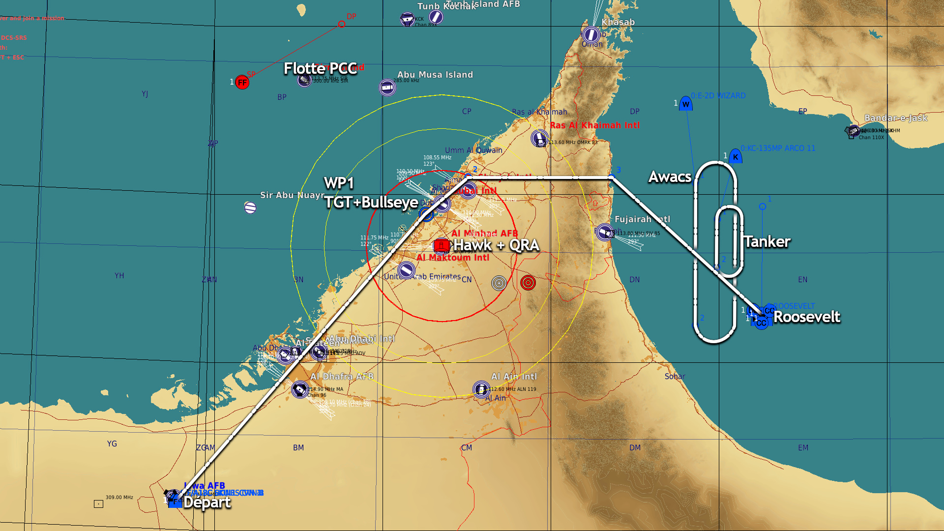 Départ de Liwa, WP1 = Targets + Bullseye, WP2+WP3 = Egress, retour Roosevelt. Ravitailleur dispo sur la route retour. Attention: il vole discrètement à 1000ft. Début de mission : 2300L TOT : 0000L AWACS = Wizard. Autres informations :