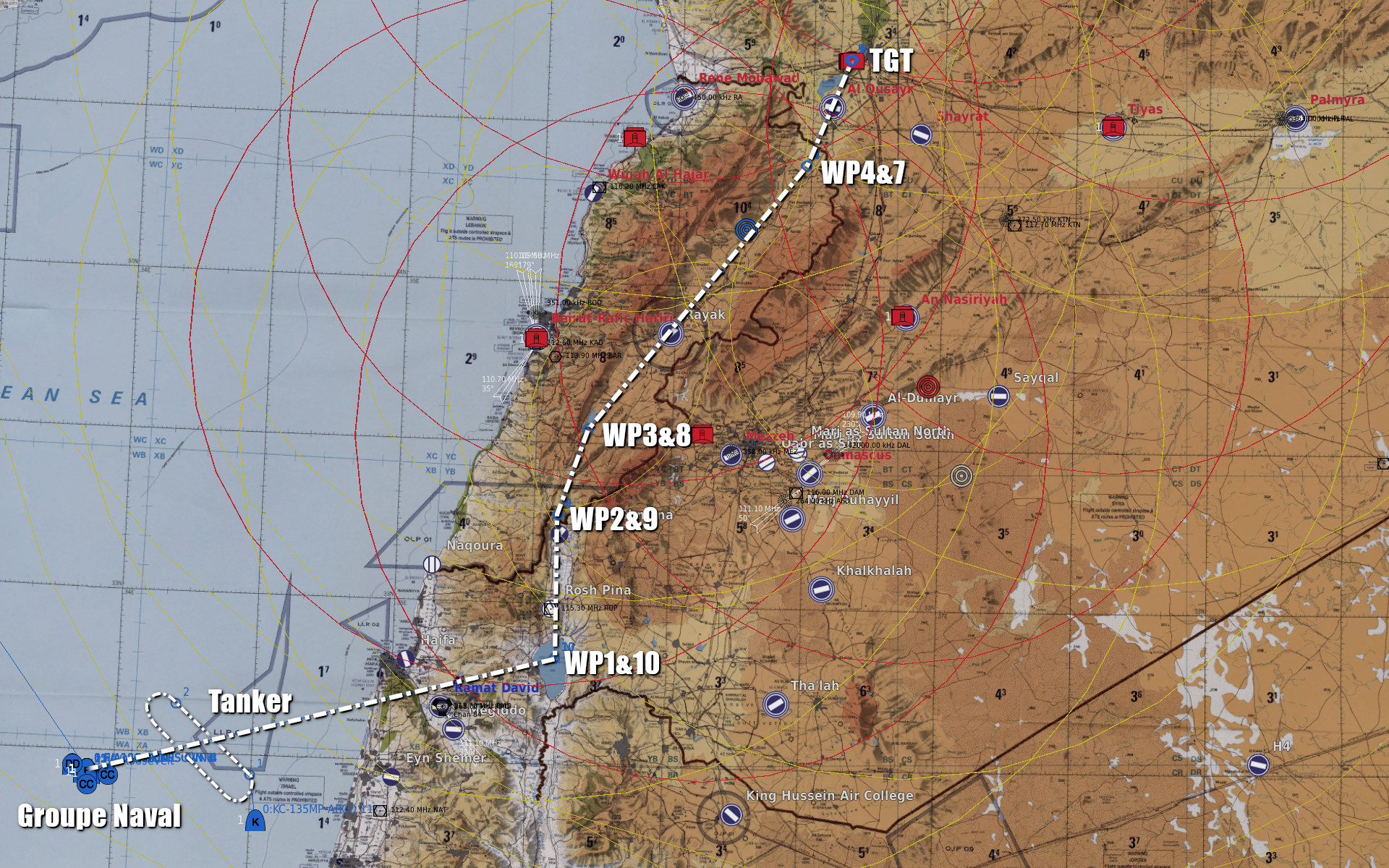 WPT1 : EWR LATAKIA WPT2 : SA2 BASSEL AL-ASSAD WPT3 : EWR AL QUSAYR WPT 4 : SA11 SHAYRAT WPT5 : EWR MEZZEH WPT6 : SA10 DAMAS WPT7 : BULLS - Rene Mouawad Menaces :