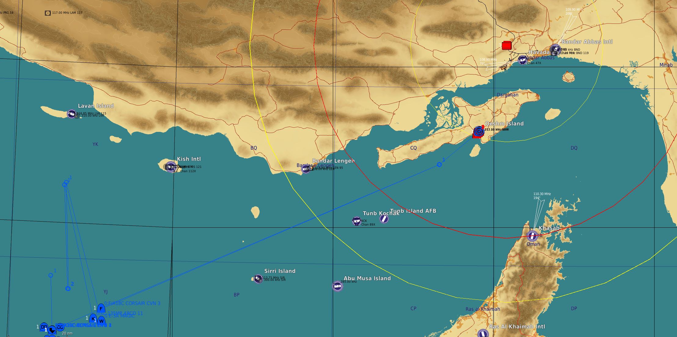 Les trois dignitaires de l'axe du mal doivent se retrouver en bas de la Burj Khalifah à minuit précises. Nous frapperons à ce moment. Trois cibles au même endroit : - L'hélicoptère de Pin Pan Poo, - Le Yacht de l'ayatollah Grominet, - Le bus jaune d'Ali Abdel Abu Al Adibou (donc: tout sauf La Burj Khalifa, bande de cancres) Les méchants surveillent le Roosevelt et sont prêts à répondre à la moindre alerte. Pour contourner leur vigilance, les Hornet du VFA-103 ont été désassemblés, acheminés en pièces détachées par camion vers la base désaffectée de Liwa, et remontés sur place. Pour ne pas se faire repérer, il faudra voler à moins de 500ft jusqu'à la cible. Puis se barrer fissa pour échapper à la QRA (F-15) et au Sam (Hawk) situés à Al Minhab. La frappe doit avoir lieu à minuit précise. Un agent infiltré, sosie de Lionel Messi, lancera une fusée éclairante depuis la Burj Khalifa.  Plan de vol :