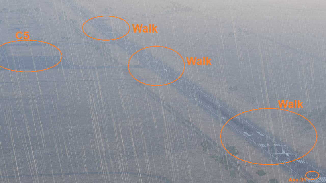 Raser l'aeroport de Qeshm, elephant walk & parking Rester en vie La walk se compose de 3 groupes sur la piste Des C5 au parking, non prioritaires, mais à détruire si possible.  Plan de vol :
