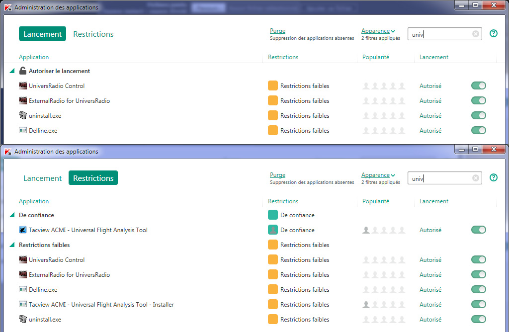 Les .exe d'UR sont en "restrictions faibles" (niveau par défaut en dessous de "de confiance"). En revanche, TS3 et DCS sont bien en "de confiance". TS3, me souviens plus, possible que ce soit par défaut. DCS, c'est un réglage manuel nécessaire (de même qu'il est nécessaire de désactiver (pas quitter) KIS pour que les updates DCS fonctionnent ; pas de pb pour le master server). --------------------