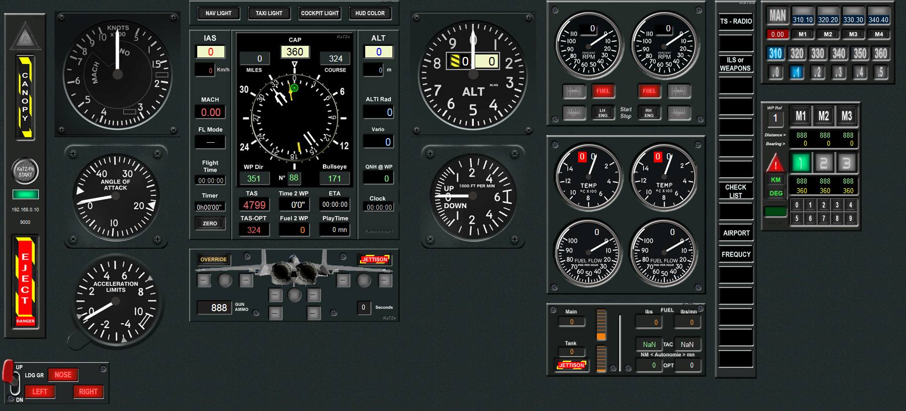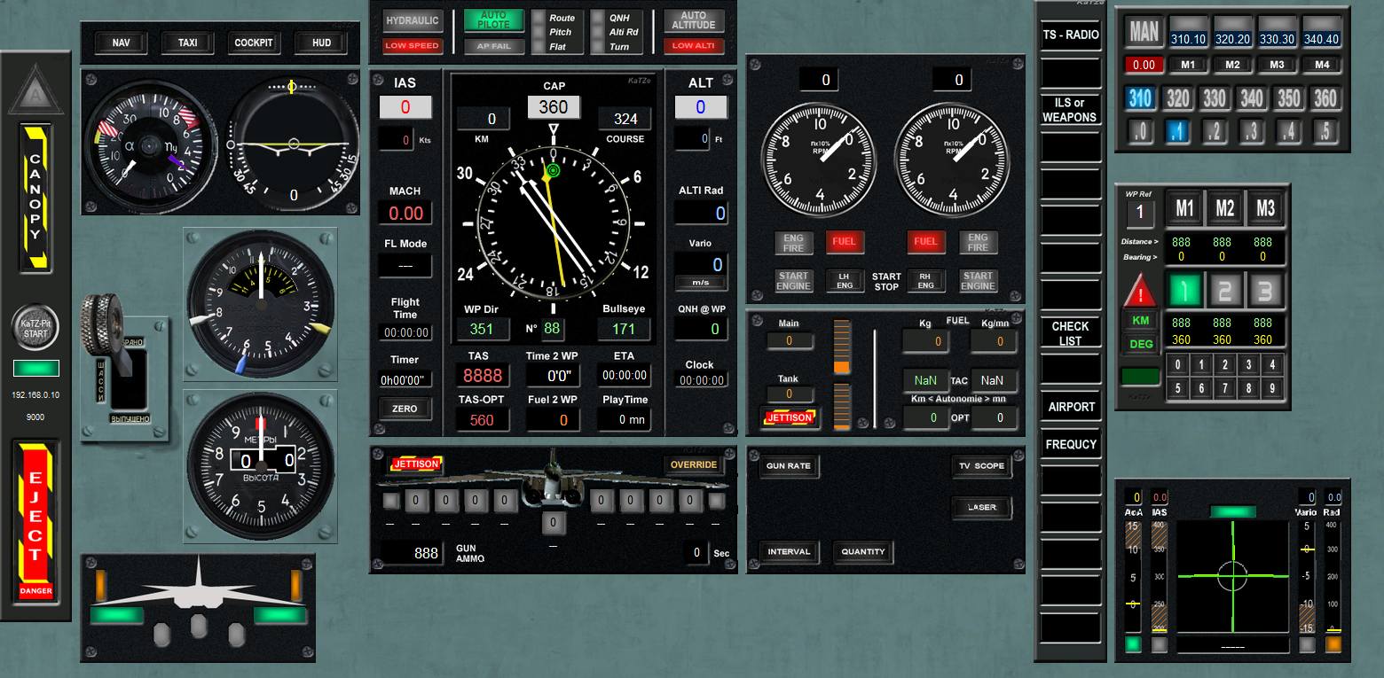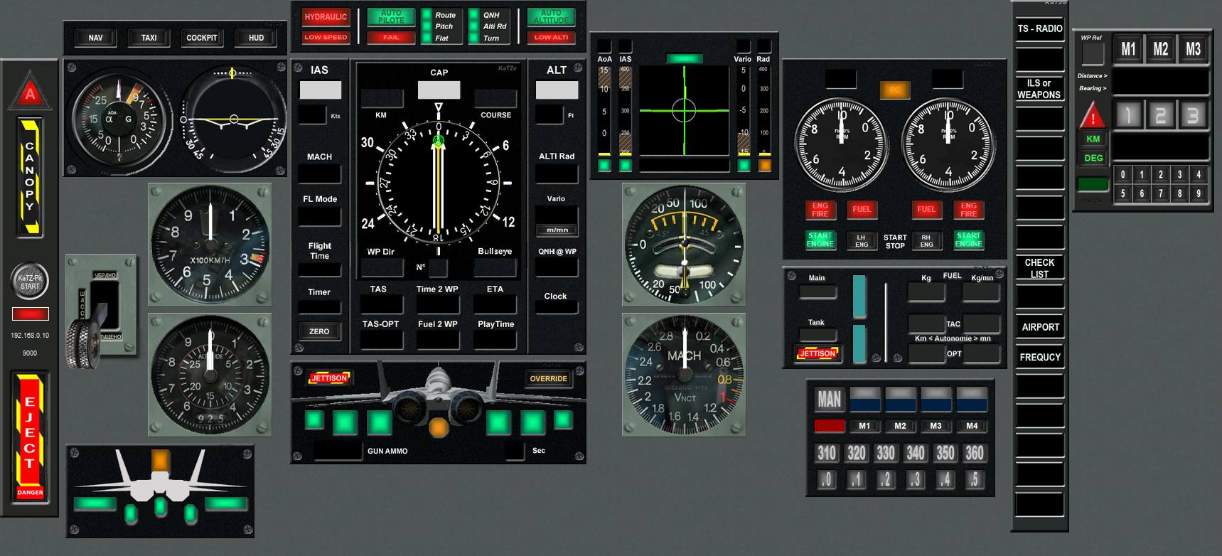 > l'AoA, le GMetre, le taux de roulis, le badin avec Machmetre, l'AltiBaro ainsi que les cadrans moteur (rpm) avec alarmes et fonction de démarrage. > Les commandes de feu de nav, taxi, cockpit light, couleur de hud > Le retour des mod. de pilototo > le panel de navigation est complet avec HSI, calcul d'autonomie, de playtime, et conversion des paramètres de vols en unité métriques, pour les Comao > Le panel Fuel avec calcul d'autonomie > La commande TS > Le Target Panel permettant de marquer trois points en coordonnée bulls et d'y retourner. > Le panel weapon est complet avec indication des armements, quantité, jettison + override. > Bouton de configuration de l'armement gunrate/Interval/Quantity etc etc ... > Panel élément avec 3 vertes, AF, Flaps. > Levier de commande du train animé et fonctionnel > Ajout du tableau de fréquence pour démontrer le principe d'affichage des checklist Voilà, demain j'attaque le 33 pour Bouling Miaou Ce message a été modifié par KaTZe - 9 Feb 2015, 21:57. --------------------