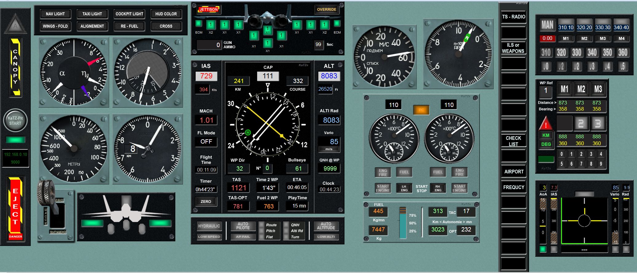 A installer avec l'EKPI de préférence : EKPI ICI (lire le readme) Le SU25T, le F15 et le Mig29, sont maintenant sur le mod mixte avec affichage analogique et numérique. Pour le F15, on a : > le badin, l'AoA, le GMetre, l'AltiBaro, et le Vario ainsi que les cadrans moteur (rpm, temp, et fuelflow) avec alarmes et fonction de démarrage.. > Les commandes de feu de nav, taxi, cockpit light, couleur de hud > le panel de navigation est complet avec HSI, calcul d'autonomie, de playtime, et conversion des paramètres de vols en unité métriques, pour les Comao > Le panel Fuel avec calcul d'autonomie > La commande TS > Le Target Panel permettant de marquer trois points en coordonnée bulls et d'y retourner. > Le panel weapon est complet avec indication des armements, quantité, jettison + override. > Panel "trois vertes" > Ajout du tableau de fréquence pour démontrer le principe d'affichage des checklist Pour le Mig29, on a : > l'AoA, le GMetre, le taux de roulis, le badin (j'ai ajouté une indication pour les vitesses > 1000km/h), l'AltiBaro deux aiguille > Côté droit , Variometre, Bille (pour le moment le taux de virage est fixe (pas trouvé l'export) > Les cadrans moteur (rpm) avec alarmes et fonction de démarrage. > Le panel Fuel avec calcul d'autonomie (comme sur le Mig réel) > Les commandes de feu de nav, taxi, cockpit light, couleur de hud > Le retour des mod. de pilototo > le panel de navigation est complet avec HSI, calcul d'autonomie, de playtime, et conversion des paramètres de vols en unité métriques, pour les Comao > La commande TS > Le Target Panel permettant de marquer trois points en coordonnée bulls et d'y retourner. > Les panel weapon est complet avec indication des armements, quantité, jettison + override. > Panel élément avec 3 vertes, AF, Flaps. > Levier de commande du train animé et fonctionnel > Ajout du tableau de fréquence pour démontrer le principe d'affichage des checklist Ce message a été modifié par KaTZe - 9 Feb 2015, 21:57. --------------------
