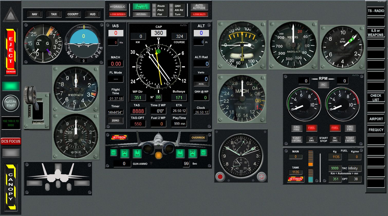 @Gizmo, Pour reprendre un peu la genèse du KaTZ-Pit (dont les demo sont toujours dispo sur mon espace public : http://server.3rd-wing.net/public/KaTZe/KaTZ-Pit/demo/ D'ailleurs pour ceux qui veulent utiliser le target panel, je vous engage d'ailleurs à regarder la demo : Demo-KaTZPit_v500-f.avi (faire click droit > enregistrer sous) J'ai commencé à travailler sur ce panel à l'époque de Lock-On FC1, un jour où j'ai ugradé mon PC, en me demandant ce que j'allais faire avec le vieux. Idem quand j'ai récupéré un vieux ordi portable desafecté de mon boulot. C'est donc l'idée de pouvoir afficher son tableau de bord, sur une 2eme machine. Bien sur avec les multi-écran (et les progrès des puissances machine) on peut faire cette fonction sur la machine de jeu. Cette dernière version donne toute latitude, à savoir affichage sur la machine de jeu, sur 2-3-4-n écrans, sur une 2eme machine déportée, sur 1-2-3-n écrans, quelque soit l'OS, où sur une/2/3/4 machines distantes à 1000km si l'on veut. L'affichage en overlay sur le jeu n'est pas dans le cahier des charges (puisque le but est de décharger la machine de jeu et non de la charger). Par contre comme expliqué par Etcher, le fait d'utiliser l'interface html (page web), fait que l'on peut ajuster à la taille voulue sur l'écran (ctrl+ ou ctrl-). Et ouvrir 1 pit par écran affichant ce que l'on veut. Pour ceux qui veulent customiser, il suffit d'aller ouvrir le fichier .css (Cascading Style Sheet), où chaque élément du panel est référencé. Par exemple sur le SU33, dans KaTZ-Pit_SU33.css, tu vas trouver CODE #Cadran_IAS { position: absolute; top: 120px; left: 370px; font-family:arial, sans-serif; /* Dimension 200 x 200 */ } Ce cadran se trouve donc à 120 pixels du haut de la feuille et 370 pixels de la gauche. Si tu veut adapter sa position (à un masque en dur par exemple), tu peux changer ces coordonnées, et le cadran entier (y compris les éventuelles valeurs affichée, aiguilles etc etc) va se déplacer là où tu veux. Ceci, dit, j'ai passé beaucoup de temps à essayer de reproduire vos pits comme affichés dans le jeu, donc il est probablement judicieux de tester ainsi avant de customiser. Par contre, le launcher panel à droite, pour le moment est peu utilisé (sur FC3), mais avec vos demandes, on va pouvoir afficher un tas d'autres choses ... et là le positionnement va peut être changer, en fonction des écrans de chacun ... c'est la raison pour laquelle, Etcher a le projet de voir si on peut concevoir une interface drag and drop qui vous permettrait de bibouiller plus facilement votre affichage. Miaou Merci beaucoup pour ton explication KaTZe! Enorme travail!!! Que envisage tu guizmo ? si tu veux le faire passer sous dcs tu peux ! ou sur un tablette sa dérange en rien ! et ce même sans internet ! si j'ai bien tout compris! Oui j'aurais voulu intégrer le MDF parmi les instruments. Si je passes le KaTZe pit sous DCS, j'imagine qu'a chaque clique il repassera devant etc. @gizmo: après une recherche rapide: http://www.makeuseof.com/tag/peek-through-...board-shortcut/ http://www.howtogeek.com/howto/44915/how-t...y-in-windows-7/ Pas besoin d'internet effectivement =) J'ai intégré la synchro des multi pits dans la dernière alpha du Link, tu peux avoir autant d'écrans que tu veux connectés au KatzeLink, et par écran j'entend: un simple navigateur internet. Il suffit d'avoir le KatzePit qui t'intéresse (par exemple celui de FC3) et d'ouvrir la page html sur l'appareil que tu veux utiliser. Le seul souci éventuel, il est possible que le firewall (windows ou autre) fasse obstacle. Le KatzeLink est un serveur TCP, par défaut sur le port 9000. Merci pour cette solution Etcher. La transparence est une solution mais elle va diminuer la visibilité globale des instruments et donc la lecture sera moins facile... |