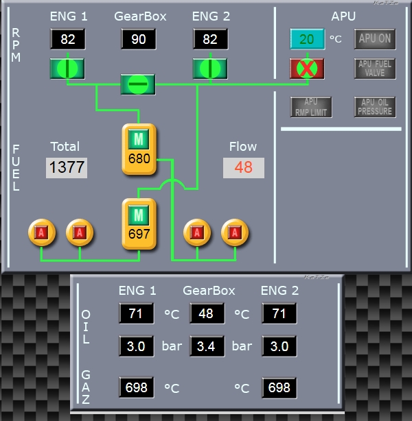 Toutes proportions gardées, voilà où j'en suis ce soir : > J'ai changé les couleurs pour être en ton uniforme > Le Panel Fuel est fonctionnel (mais pas encore clickable) > Le HSI+, est fonctionnel (il me manque juste la TAS) > J'ai terminé le panel moteur Pour ce dernier (et/ou d'autres) j'ai besoin de vos suggestions ... je trouve perso que les info. importantes sont super mal indiquées sur le Kamov. En réfléchissant, je m’aperçois que perso je surveille beaucoup le Vario et l'IAS (aussi bien pour l'overspeed que le risque de Vortex). J'ai donc tout regroupé au centre avec - une alarme Overspeed que j'ai pour le moment mise à 250km/hr (une suggestion ?) - une alarme Vortex (pour mon ami Demon (Ca vous parait correct ?) Pour la gestion des turbines (et les autorot) , j'ai aussi besoin des RPM rotor, du pitch, et de ce qu'ils appellent le mode moteur (qui est super mal placé sur la banquette avant droite, c'est incompréhensible). Avec ce rappel au centre des rpm/pitch/et puissance je pense pouvoir largement améliorer ma gestion moteur. (Partagez vous ce point de vue ?). Pour les gestions temp et pression huile, mon affichage change de couleur quand on sort des valeurs nominales Les petites barettes (peu lisible des jauges du KA), sont elles juste ? Qu'est ce qui est nominale le scotch vert ou les index rouges (il y en a trois ?), quelles valeurs prendre ? Que se passe t'il si le scotch se décolle ? Voilà, pour les suggestions n'hésitez pas Ce message a été modifié par KaTZe - 26 Nov 2014, 18:14. --------------------