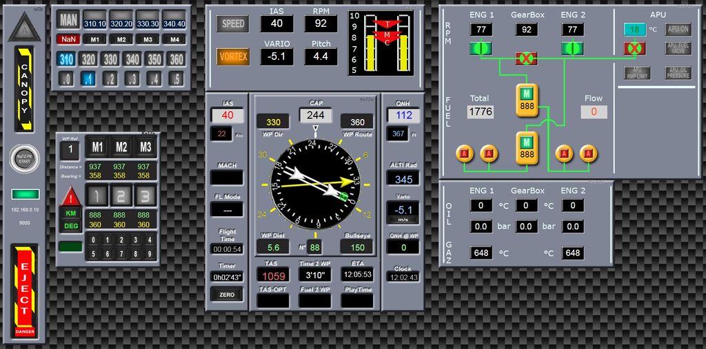 Le moniteur va pouvoir surveiller les rpm, températures, pressions de son élève Pour ne pas faire double emploi avec Helios, j'ai volontairement opté pour une approche panel "semi-moderne", type overhead panel d'Airbus Ca marche pas mal pour le moment (juste un chit problème pour les positions on/off (vannes, moteur ...) C'est quand même plus ergonomique que les tableaux de bord russes Un ptit screen en fonctionnement : Miaou Ce message a été modifié par KaTZe - 24 Feb 2015, 11:49. --------------------