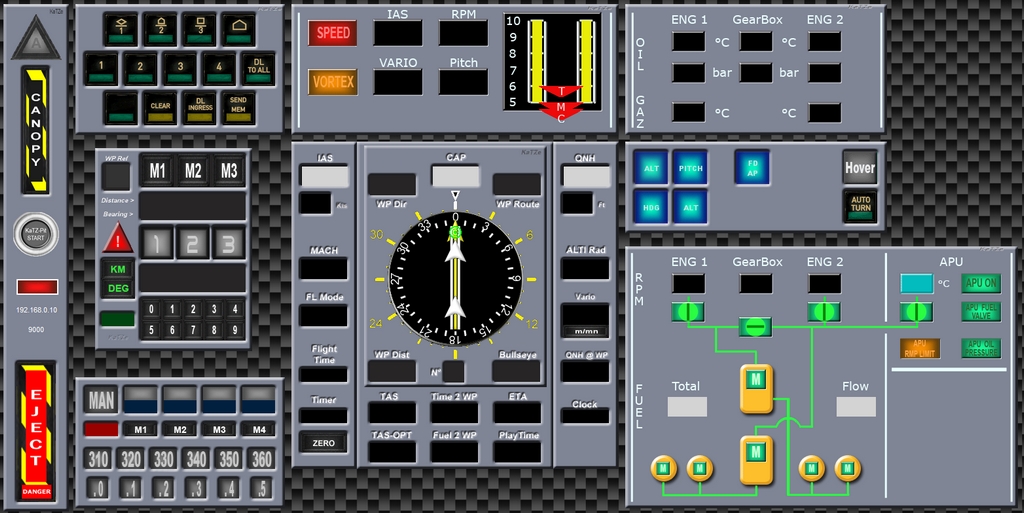 Question bête probablement, mais par rapport à un Helios Katze? Ca m'apporte quoi? Touchscreen pit Tu voudras pas faire le Mi-8 après? Je n'ai jamais utilisé helios, because sur le Mi29 çà n'avait pas d'interêt. Mais si je ne me trompe pas, Helios tourne sur la même machine que DCS, et va permettre de mettre des morceaux de pit en overlay sur les écrans attachés à la machine de jeu. Quand j'ai commencé à travailler sur le KaTZ-Pit il y a maintenant plus de 4 ans, d'une part Hélios n'existait pas, et d'autre part, mon objectif était différent. Je ne cherchais pas forcément à reproduire le pit de DCS, et d'autre part, je voulais utiliser une deuxième machine (à l'époque c'était un portable que je plaçais sous mon écran de jeu). Grace à la dernière évolution en websocket, la deuxième machine peut être n'importe où. Hier soir, Etcher et Demon, se sont connecté sur le KaTZ-Pit installé sur le serveur de la 3rd, et j'ai changé les valeurs qu'ils voyaient depuis chez moi. On peut donc ainsi faire de la double commande, ou du suivi d'instruction à distance. La seule chose qui ne soit pas "envoyé" étant la vision 3D. Ca , si j'ai bien compris Hélios ne le fait pas (tout sur la même machine). Pour ce qui est du Mi8 (que je viens d'acheter), il faut qu'on en discute rapidement because si on peut se mettre à deux dans une machine dans DCS, alors avec le KaTZpit, on pourra partager le contrôle de la machine ... je pense même qu'on doit pouvoir le faire en Ka50 sur des missions type ASM (l'un pilote et l'autre fait le Tacco) A partir du moment où l'export/transmission de données fonctionne, (ce qui est le cas), alors presque tout est possible en mode coop @Etcher si tu as besoin d'aide je suis sur TS jusqu'à 19h00 @Gilles, on pourra essayer un vol d'écolage avec la première version, si tu veux pour voir quel délai on a --------------------