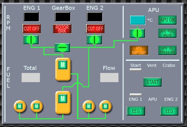 Travail de la soirée, modif du panneau Fuel démarrage, avec les cut off, le rotor break, la position du selecteur de démarrage, du type de démarrage et des EEG. Tous ces modif, grace à l'export de la position des boutons (toujours avec la même lecture dans main_panel), donc çà sera facilement transposable au MI-8 ou au Huey --------------------