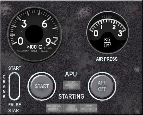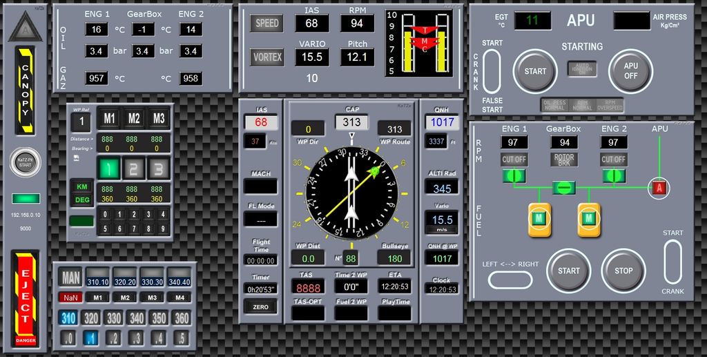 > Les panel "numariques modernes" APU et Fuel/Demarrage Moteurs (qui me servent à mettre au point le soft), sont finalisé (il me reste même de la place pour 1 ou 2 voyants d'alarmes). Pour les commandes sélection et démarrage le layout est similaire au panel Mi-8, on click sur la légende voulue (Left, Right, Start, Crank, False), et sur les boutons Start/Stop Pour les commandes de vannes fuel, pompes, cutoff on click directement sur les voyants > Pour le reste du pit, les fonctions de conversion des valeurs des échelles non linéaire (APU, Vario, IAS, Alti ...) ont été réalisé comme script javascript. Ainsi, je pourrai afficher les valeurs réelles en numérique ou faire tourner les aiguilles avec les cadrans non linéaires pour un affichage analogique avec les valeurs brutes 0-1000. > Reste encore à checker, les échelles de température et quelques petits détails, et j'espère pouvoir mettre une 1ere version en ligne demain soir. Miaou --------------------