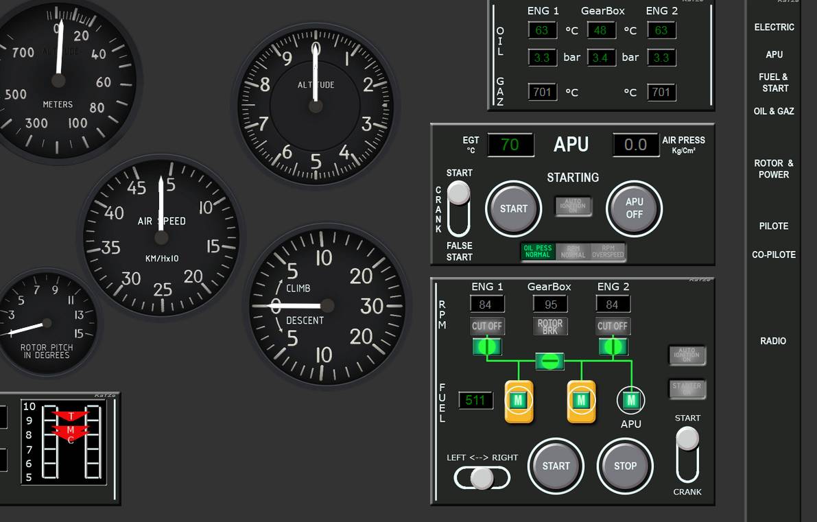 J'ai mis en ligne (espace public v06) en fin d'aprem, le Pit Mi-8 avec le launcher comprenant maintenant, la commande des circuits breakers, et les panneaux electric AC et DC