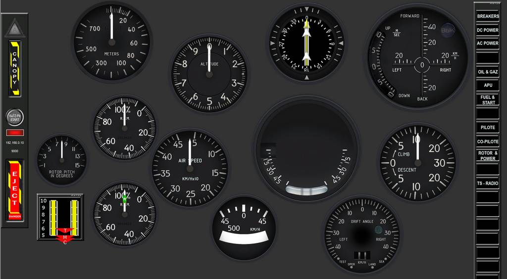 http://server.3rd-wing.net/public/KaTZe/Helo-Pit/Mi-8/ Rien à changer dans le KaTZlink, par contre les export/Sioc/et le panel sont modifiés Le pit Mi-8, comprend maintenant le launcher à droite permettant d'afficher ou de faire disparaitre les panneaux Breaker, DC-Power, AC-Power, APU, Start+Fuel, Radio-TS ... Les panneaux Circuit-Breaker, DC-Power, AC-Power sont nouveaux et fonctionnent en commande. > Le panneau Circuit-Breaker permet d'actionner les switches de groupe > Les panneaux AC et DC pilotent des switches, il suffit de clicker au dessous ou en dessous pour les deux voies, ou dessus/dessous/A côté pour les 3 voies, ou sur la position voulue pour les rotateurs). La position des interrupteurs n'est pas encore retournée > Pour les panels pilote/copilote, j'ai positionné les principaux cadrans, il ne sont pas encore switchables avec le Launcher. En fait le panneau réalisé pour le moment est un mix des deux panels. A voir si vous préférez cette solution, ou un switch Pilote/Copilote Je pense que l'HSI fonctionne mais il me faut encore une journée de boulot pour l'ADI, l'indicateur de stationnaire. et les drifts (je les ferai après le vol de formation en nav. de la semaine prochaine. Bonne fin d'année, et bonnes fêtes à tous Miaou Ce message a été modifié par KaTZe - 30 Dec 2014, 21:25. --------------------