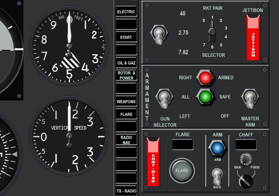 Finalisaiton du panel armement avec la gestion des flares Réalisation des Engines-panels pour la procédure de démarrage Reste donc le panel Electric et Radio Nav. et le bébé sera fin prêt Miaou PS pour Postal : J'ai pas oublié, dès que le Huey est fini je repasse sur FC3 pour harmoniser avec le reste des hélo, et utiliser le principe du Launcher pour la selection des panels affichés Ce message a été modifié par KaTZe - 20 Jan 2015, 19:00. --------------------
