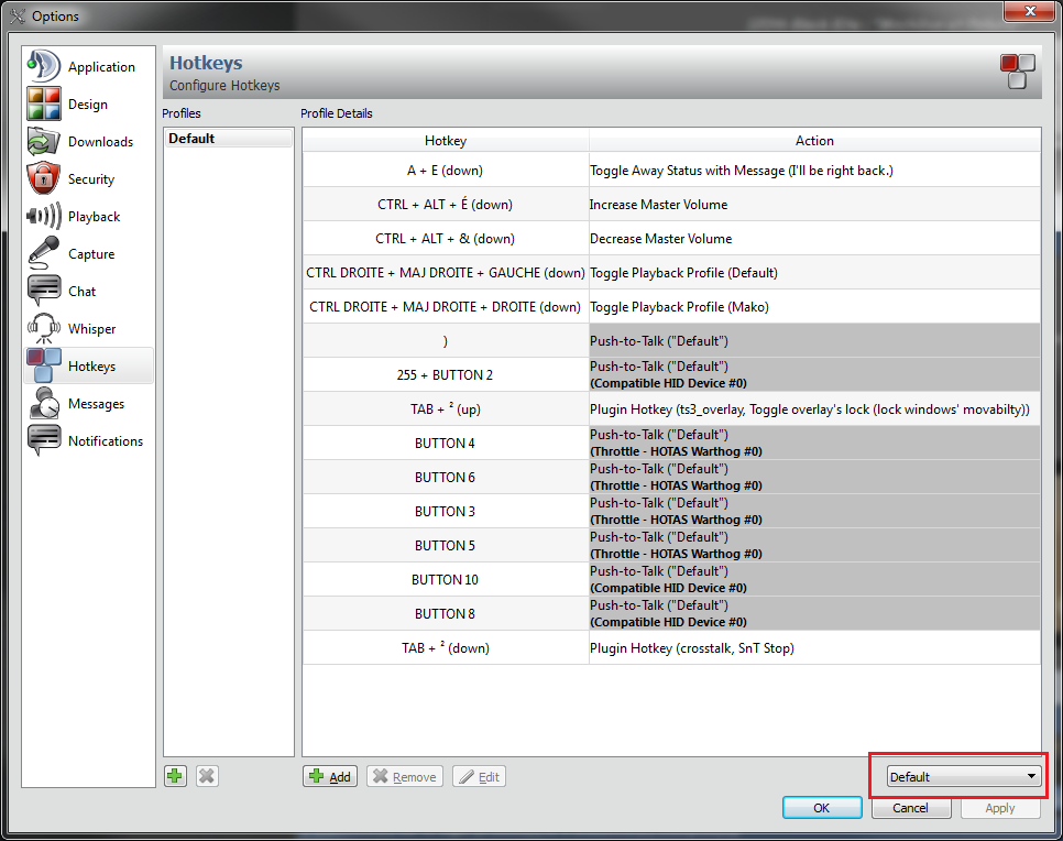 Je n'arrive pas à configurer sur TS les boutons du Throttle, je n'ai accès qu'au clavier et souris... Quelqu'un aurait une procédure pour les nuls pour le X-55 Rhino ? [Edit] Alors à force de persévérance j'ai réussi à mapper les boutons mais ça ne fonctionne (en testant via TS) pas si dans la config Hotkeys je mets "hotkey system" sur "Keyboard & Mouse only". Et si je ne mets pas cette option, j'ai les commandes du X-55 qui délirent... Ce message a été modifié par Kylurm - 3 Oct 2015, 12:50. --------------------
