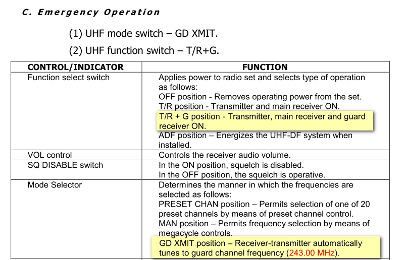 Il y a du y avoir usurpation d'identité C'est un souhait de sp@t datant de plusieurs mois. Ma réponse était : demande de preuve documentaire que cette fonctionnalité existe sur le ARC US Ou début d'Al.... Blague à part, cette fonctionnalité existe aussi sur l'ARC-51 UHF du Huey. La radio est équipée d'un receveur 243MHz spécifique. Lorsqu’on met le sélecteur de fonction sur la position T/R+G , elle transmet et reçoit sur le chan UHF + veille la fréquence de garde. Si on passe sur "GD XMIT" on switch alors exclusivement en T et R sur la garde. Pour les doc. : > ARC-51 UHF , Ici §-"Guard receiver" > Manuel du Huey page 85 En espérant que çà vous soit utile Miaou Ce message a été modifié par KaTZe - 10 Sep 2015, 10:04. --------------------