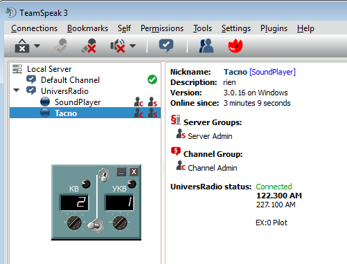 CODE ExternalRadioUR.exe (0.0.2.1) {External Radio for FC3 ou CA} . Correction of russian radios UHF VHF location UR_pluginTS3.dll 0.0.2.1 (--102015-EA) {plugin pour TS3 v20 64 bits} . Correction of code . Addition Scanner *NEW* UR_Scanner.exe (0.0.2.1) {Radio scanner for AWACS with LotATC} . First version Dispo ! http://tacnoworld.fr/universradio-download/ |