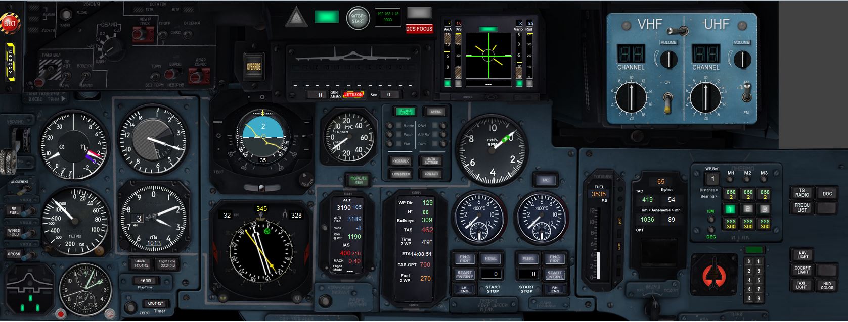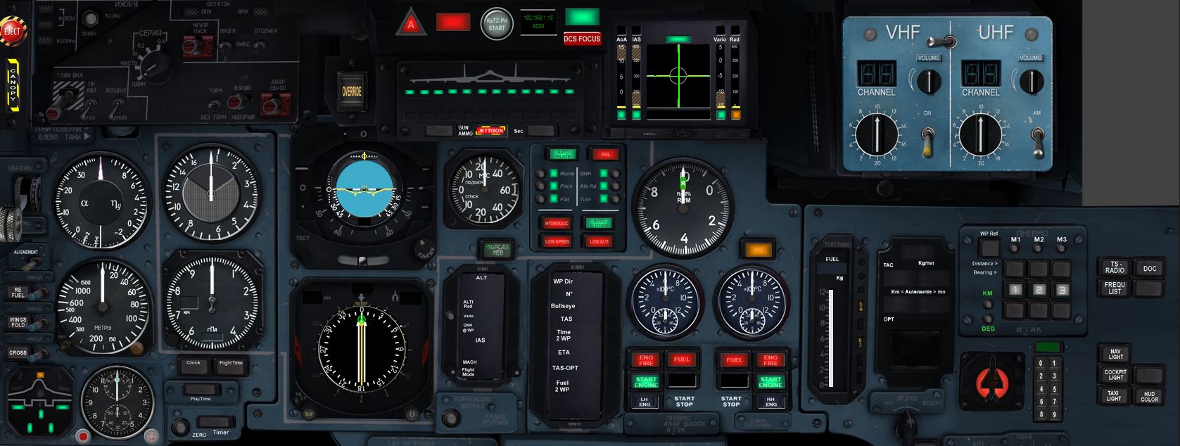 Nice ! On pourrait avoir une version en plus haute résolution, j'aimerais pouvoir identifier tous les boutons de ton panel. Merci Voici une copie plus grande, avant de mettre le pit en marche (pour voir la partie statique, j'en mets une en vol dans le message suivant) (dis moi si tu veux pllus grand , j'uploadrais un fichier en lien) En partant d'en haut à gauche on a : - emmergency : canopy + eject - les commandes de gear + spécifiques SU33 (cross, refuel, wings fold, alignment) - les indication de gear flaps + A-brake A droite de la clock j'ai mis les info de clock numérique, play time, timer+remise ) zero et flight time Tout en haut on a la gestion du pit + le global warning En dessous tout ce qui est munitions avec les deux commandes (override+ jettison) et les compteurs associés A droite du vario, c'est tout le panneau auto-pilot et en dessous les infos (incl. info calculées par le KaTZ-Pit) pour la navigation J'ai modifié l'affichage de la jauge a carburant et ajouté à coté les infos associées dedans un "afficheur numérique" A droite on trouve un panneau "Target" avec les waypoints et à l'extreme droite , en bas la gestion des lights et au dessus le launcher de doc (frequence radio, doc et affichage/masquage du panneau de radio) et la même en vol : Pour info, la partie cockpit est gérer par un PC deux écrans : l'écran central du cockpit est en 1920x1080 et celui de droite en 1280x1024, et la coupure se entre les moteur et le carburant, sur le jonction entre les deux plaques bleues. A+ Ce message a été modifié par brood34 - 31 Dec 2015, 14:43. |