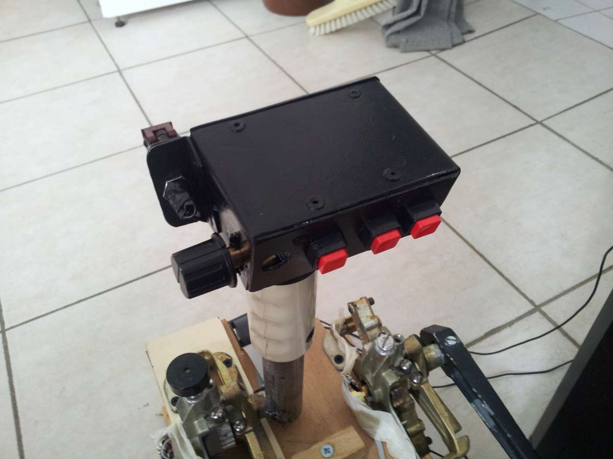 me manque juste la chaîne de chiffres du NADIR pour la commande du Pas Général , c'est une récupération , idem pour la Commande du frein rotor ![]() je pense pas qu'on trouve la même ... pour le frein la commande contrairement au PAS Général , elle est a 3 positions fixes 0° 45° et 90° , j'ai inséré dans l'axe central un potar et je peux faire du progressif avec le frein en ramollissant la commande point fixe mon travail de la journée ![]() ![]() je continue le pedestral mais ce sera pas de suite car je pars lundi ou mardi pour une dizaine de jours --------------------