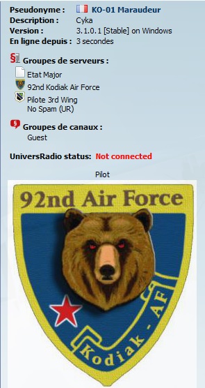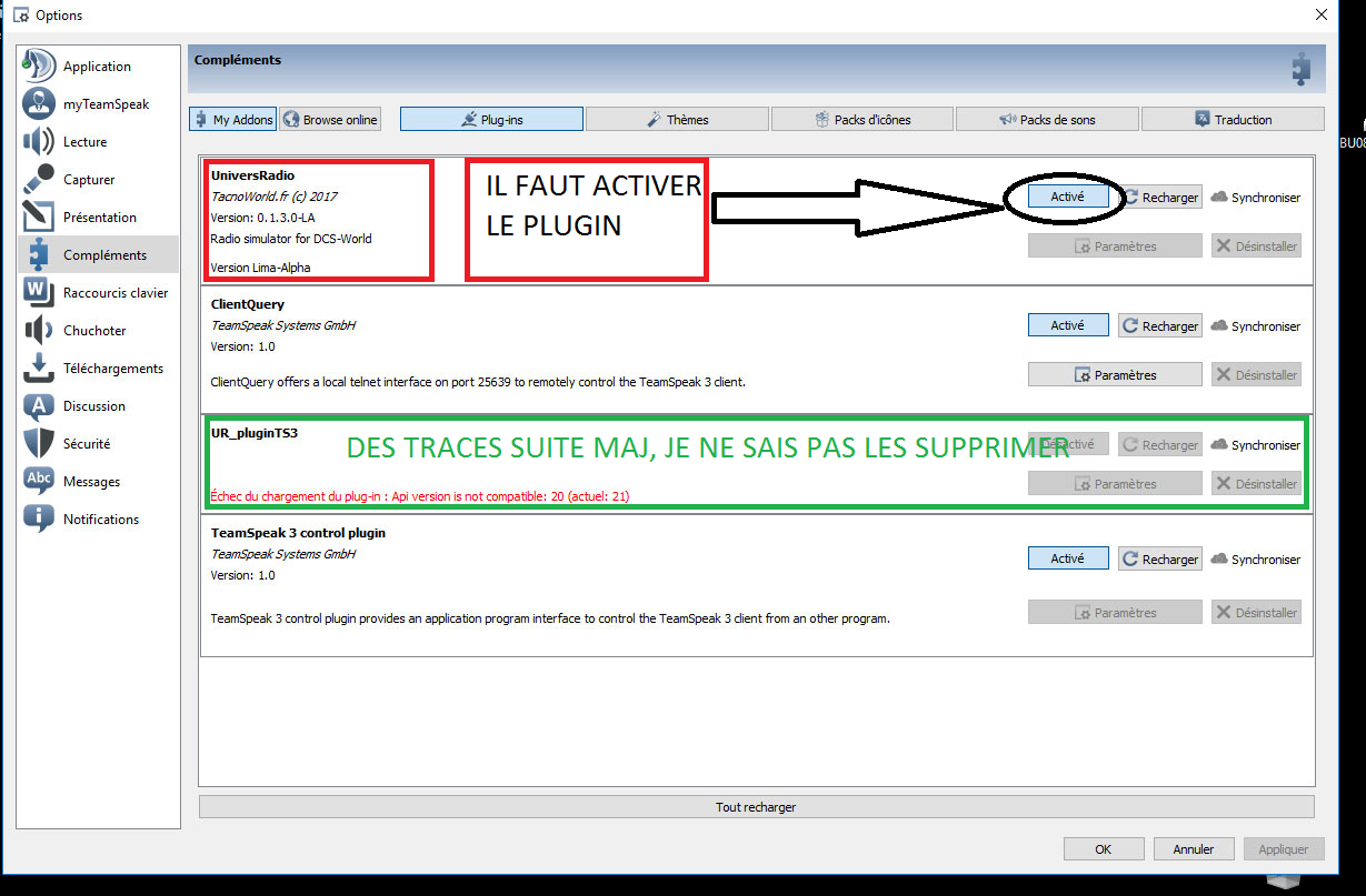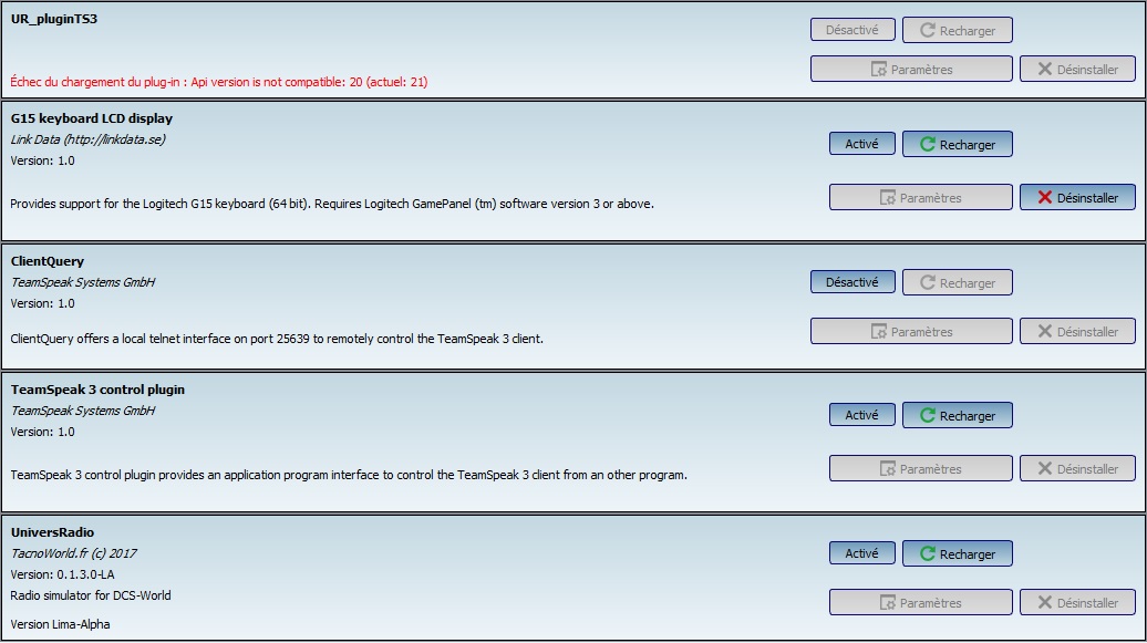 Salut Tacno, alors j'ai supprimé la dll comme indiqué. J'ai bien ça par défaut dans TS: Mais quand je consulte les plugins j'ai ça Du coup j'ai un doute sur mon fonctionnement d'UR Quand tu lis "UniversRadio status : Not connected" alors la DLL UR pour TS est installée et exécutée = tout nickel côté installation L'affichage de l'ancienne DLL dans TS est un bug TS qui affiche un mélange de souvenir de truc qui n'existe plus. Je ne pas intervenir la dessus aujorud'hui. Le fait qu'il soit affiché : Not connected veut dire TS ne reçoit pas de données de DCS. 1. parce que DCS ne tourne pas, pause... 2. pb parefeu et le 10602 non admis sur le réseau privé, ou plusieurs process de ts_clinet64.exe 3. pb d'export.lua à cause d'un autre export , consulter dcs.log --------------------