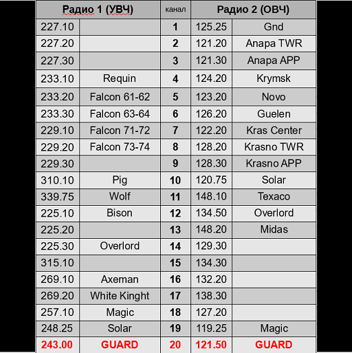 ATTENTION en VHF Chanel 8: sur le plan de fréquence 128.20 indiqué, mais 128.25 dans le fichier .ini Merci Bien vu ! Egalement erreur sur le channel 11 UHF : les WOLF 339.75 (PDF) // 339.725 (ini).. Bien vu 2 ! Marche à suivre ? j'suis aller visiter le musée aéro de La Baule, un peu de retard, CBU... v MISE A JOUR v Radio preset file : CampagneAnapa.ini (à copier sous \Saved Games\UniversRadio\ ) Ce message a été modifié par Tacno - 8 Feb 2017, 18:35. --------------------