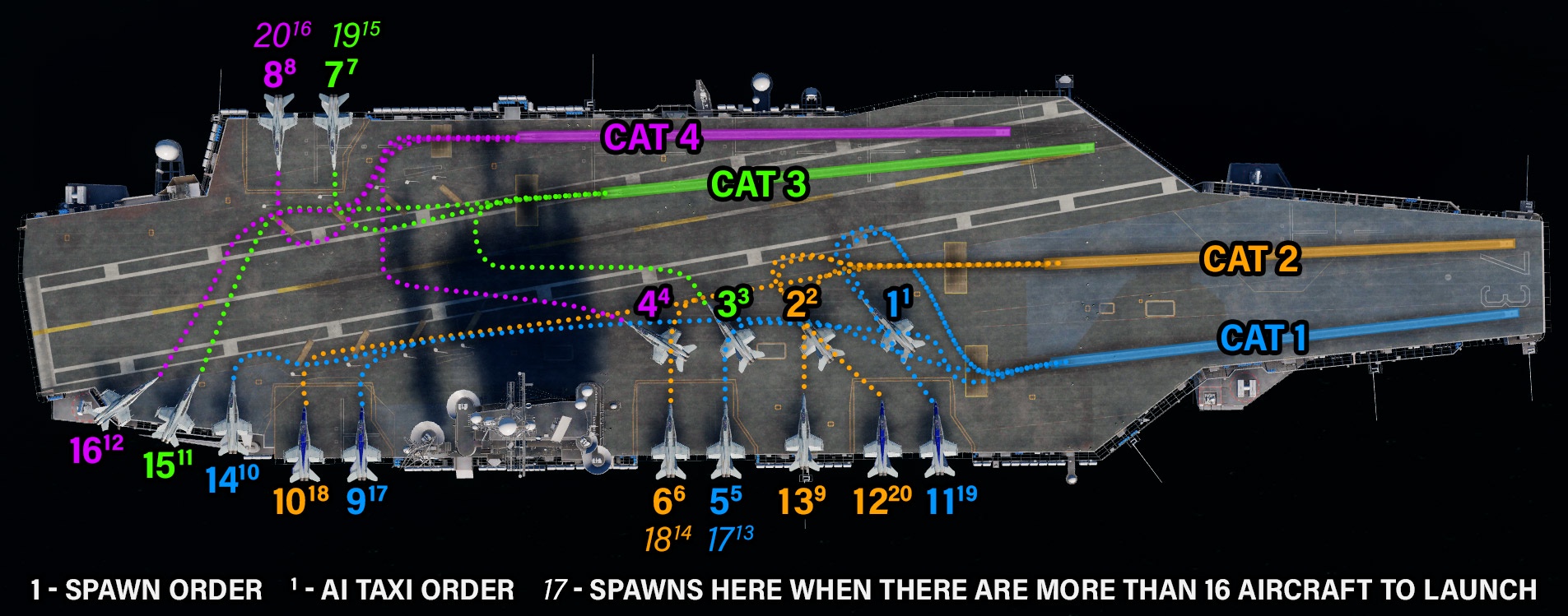 Petits retours divers et variés. Les fuzes et le panel de rearm: Il est maintenant possible de copier toute la config (code, fuze, skin) des bombes d'un pylones vers les autres pylones. C'est une bonne amélioration comparé à avant, où juste le code était copié Le panel de sélection d'avion: L'ajout "à la volée" (aka: à la sélection d'un slot) d'un plan de nav' fonctionne. Mais, il faut le faire avant de sélectionner son slot/avion, sinon il ne sera pas renseigné dans l'avion. Aussi, en cas d'oubli, deslot et reslot ne suffit pas, il faut quitter le serveur ... https://forum.dcs.world/topic/355550-route-tool-guide/ Le brouillard: Le jeu est beau. Les keyframes sont simple à utiliser. Les valeurs des keyframes ont l'air alambiquées en revanche. Exemple: départ gros fog, a splanned. Keyframe T+30', visi dist 40kft, on voit le carrier à peine à 3Nm, un facteur 2 quoi D'autres tests à faire. Le jeu est beau Le deck crew: (Video de Wags: https://www.youtube.com/watch?v=vEWFqSfh3Pc) TLDR: Ça marche si on le brusque pas. Trop restrictif à notre goût pour plus de 2 patrouilles (aka mission) Détails: