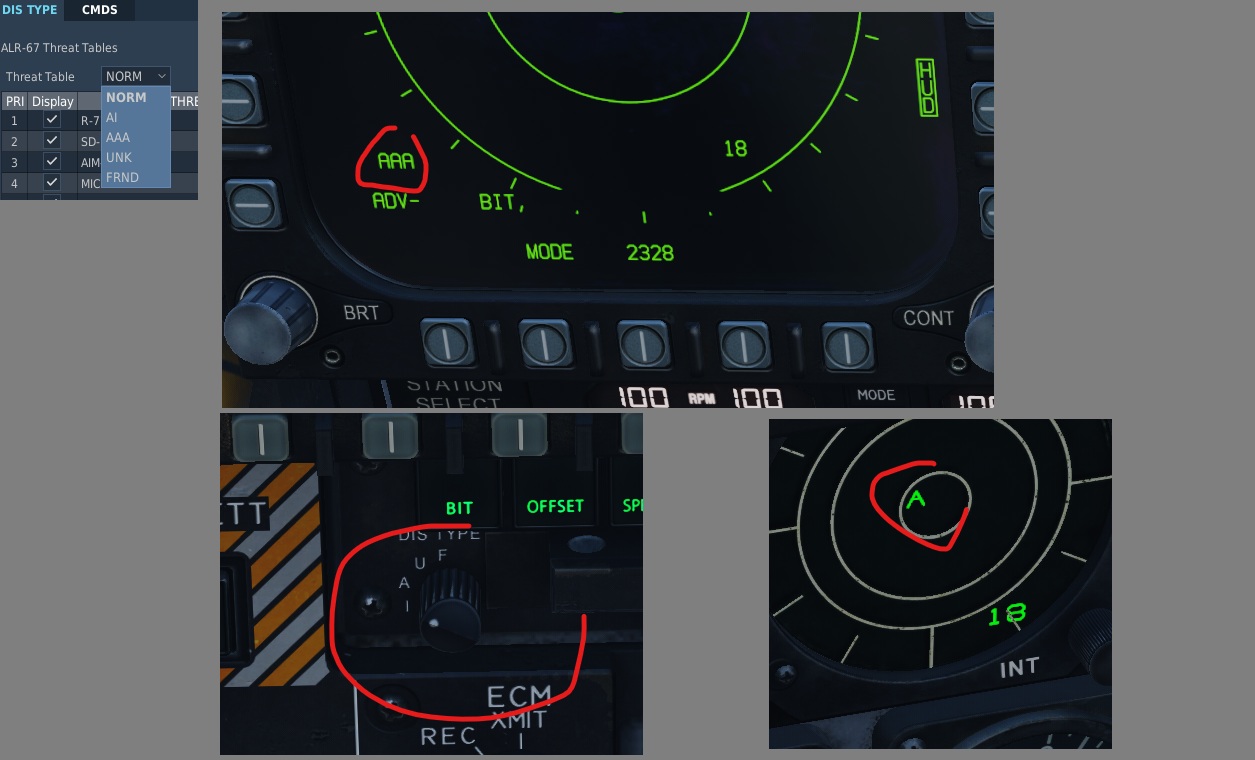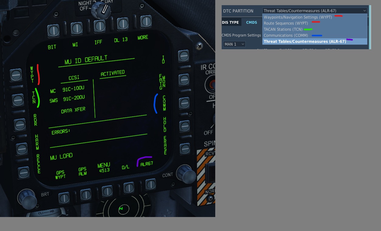 En premier lieu, rappel des deux vidéos tuto de Wags : https://www.youtube.com/watch?v=zW07BTSVXko https://www.youtube.com/watch?v=y4xLUIljI1U La plus grosse blague d'UI étant que tout se joue avec FILE->IMPORT/EXPORT ("save" sauvegarde dans le .miz ...) Avec cela, vous avez donc votre fichier .dtc quelque part près à être chargé dès que vous êtes sur la page briefing avant de faire Fly. Les quatres partitions WYPT/TCN/COMM.ALR-67 sont réparties dans 5 dropdown (la WYPT est séparée en deux): Deux des quatres partitions sont assez explicites et n'ont pas besoin de plus d'explication que ça: