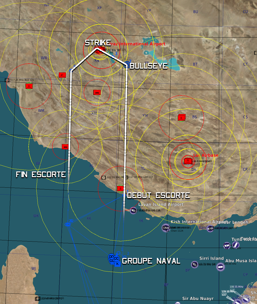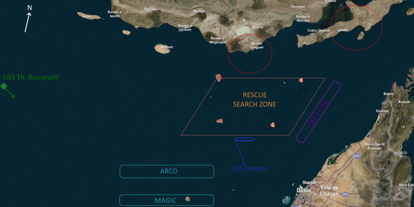 Debriefing SKULL mission Anti ship Rom Rea Anubis target : 1 Corvette lance missile (Molnyia) 2 Frégates 2 Sous Marin dans le port de Bandar Armement Spécifique 2 GBU-31 ( 1Ton GPS) TGP Ligtning II 2 AMRAAM autoprotection Décollage de la patrouille après les Bones (task AA/CAP), on avait le temps pour intervenir, le SEAD devant passer devant, et la SUPAERO être acquise. Ravito ARCO pour gagner du playtime et du temps, puis retour sur le BULLS en attente, autour de l'heure prevu (H+50). en entendant les Meurines et le SEAD et de la SITAC sur zone, je prend le partir d'attendre encore 5min. Notre profil d'attaque HA avec acceleration PCMAX avant la zone passe entre les deux iles a l'EST de l'ile de QESHM, puis on repique vers nos cibles, l'important etant de rester FEET WET. l'idée était de rentrer les coordonnées de notre répartition de cibles en WPT 2-3, et ensuite de designer TGP avec précision une fois a portée visuelle (environ 30nm) pour affiner juste avant largage. Portée dans ces conditions de largage, 20nm (M0.95, FL 320), c'est plus que correct. BDA: 2 Sous Marin coulé, 2 Frégate très fortement endommagé, la Corvette Molnyia était sortie de la zone task pour engager le TG DELTA (Tarawa). nous n’étions pas armée pour pouvoir engager des cibles mobiles, partie pris assumé vu la SITAC (AA et SAM) prévu. ravito en sortie d'engagement Antiship, on s'est proposé en support AA a l'issue, mais le roulement avec BONES et les Panthers avec cette task se faisait bien, donc no factor pour nous. RTB sans soucis sur CVN-71. --------------------