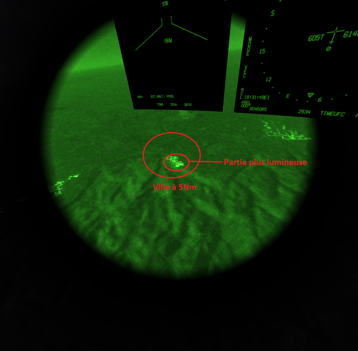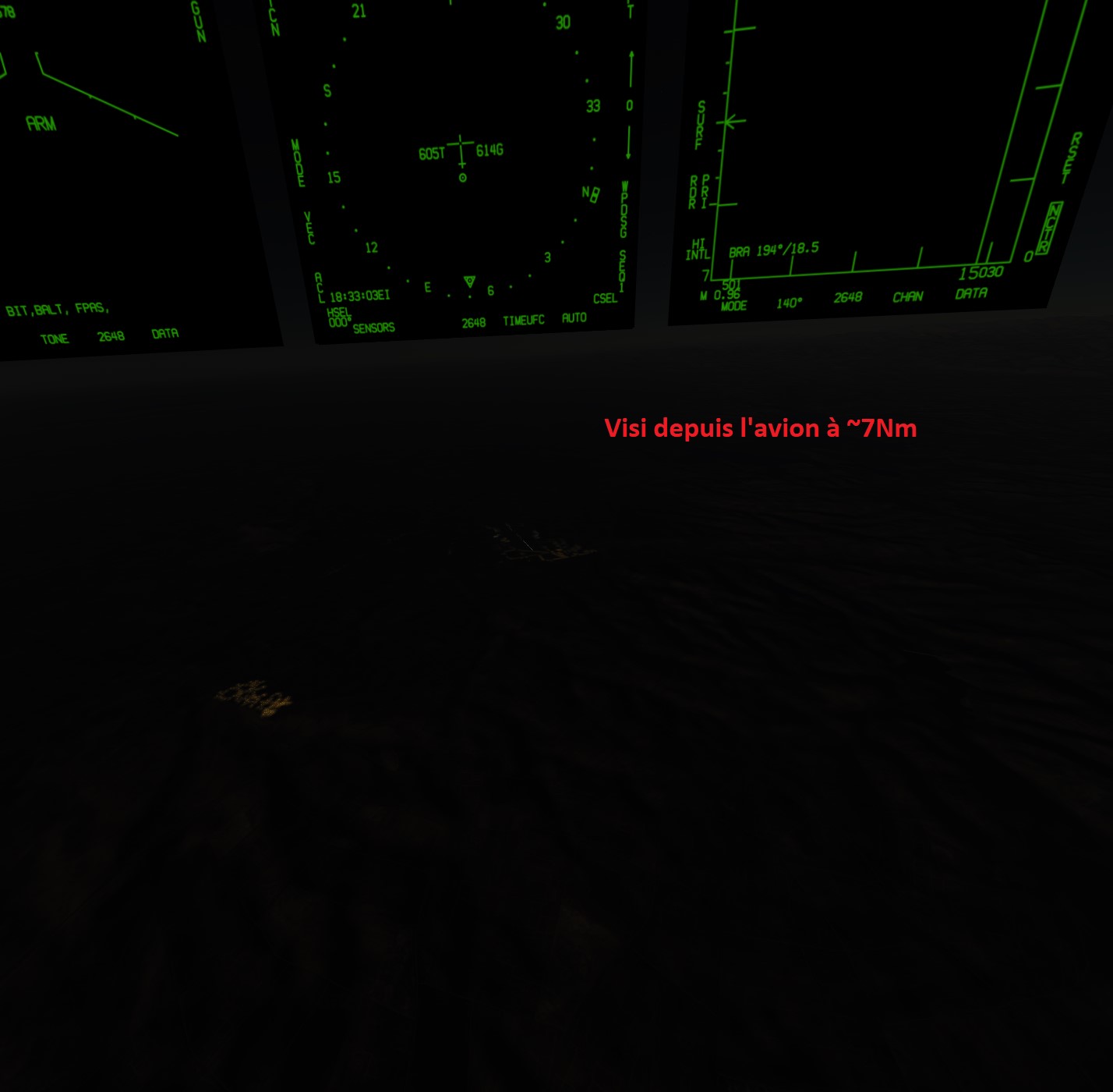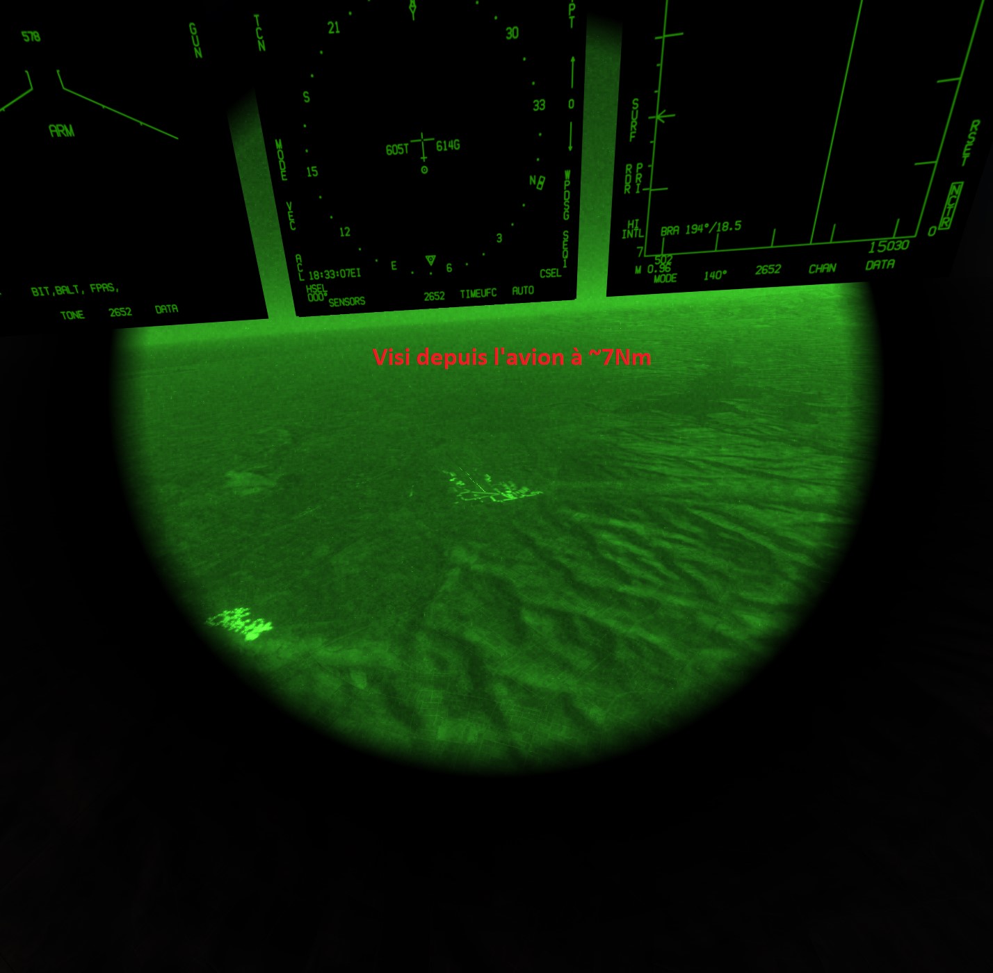 En fait le gros point de ce training a été la visibilité toute pourrie de nuit. La visibilité des villes et autre sources lumineuses est actuellement grandement réduite. La visibilité sans NVG étant égale à la visibilité avec NVG, peu importe le gain. Illustration avec lune. Aussi, les parties lumineuses des villes ne sont pas affichées de façon identiques. Une ville peut-être complement invisible si elle n'est pas assez lumineuse, même si l'ont sait parfaitement où regarder : (premier screen, il y a une ville dans le grand cercle ..., cf deuxième screeen) Bref, la visi de nuit, c'est tout pourri en ce moment. Au cas où, mes options: Aussi, la nuit d'encre sans lune, c'est, obviously, trèèèès noir. On voit que dalle même en NVG. Sauf les étoiles, elles sont magnifiques Ces tests ont été fait sur Syrie. Le TGP n'est pas affecté par ce problème, et déroule le terrain en IR à 15Nm Ce message a été modifié par Anubis - 14 Jul 2021, 09:04. --------------------