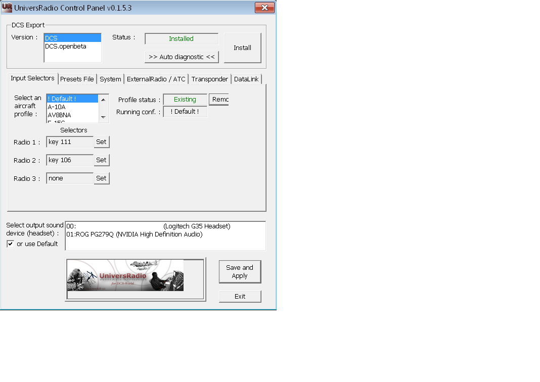 Salut Tacno est ce que tu as une solution à mon problème. Je n'ai pas la possibilité de régler les radio sur les oreilles !! Merci par avance Réa je ne sais pas résoudre ce problème d'affichage, mais on peut modifier le fichier universradio.ini dans /saved games/Universradio dans la section du profile au nom de l'A/C : -1 à gauche, 0 au centre, 1 à droite LISTENING_RADIO1=0 LISTENING_RADIO2=0 LISTENING_RADIO3=0 vaut les 3 radios au centre --------------------