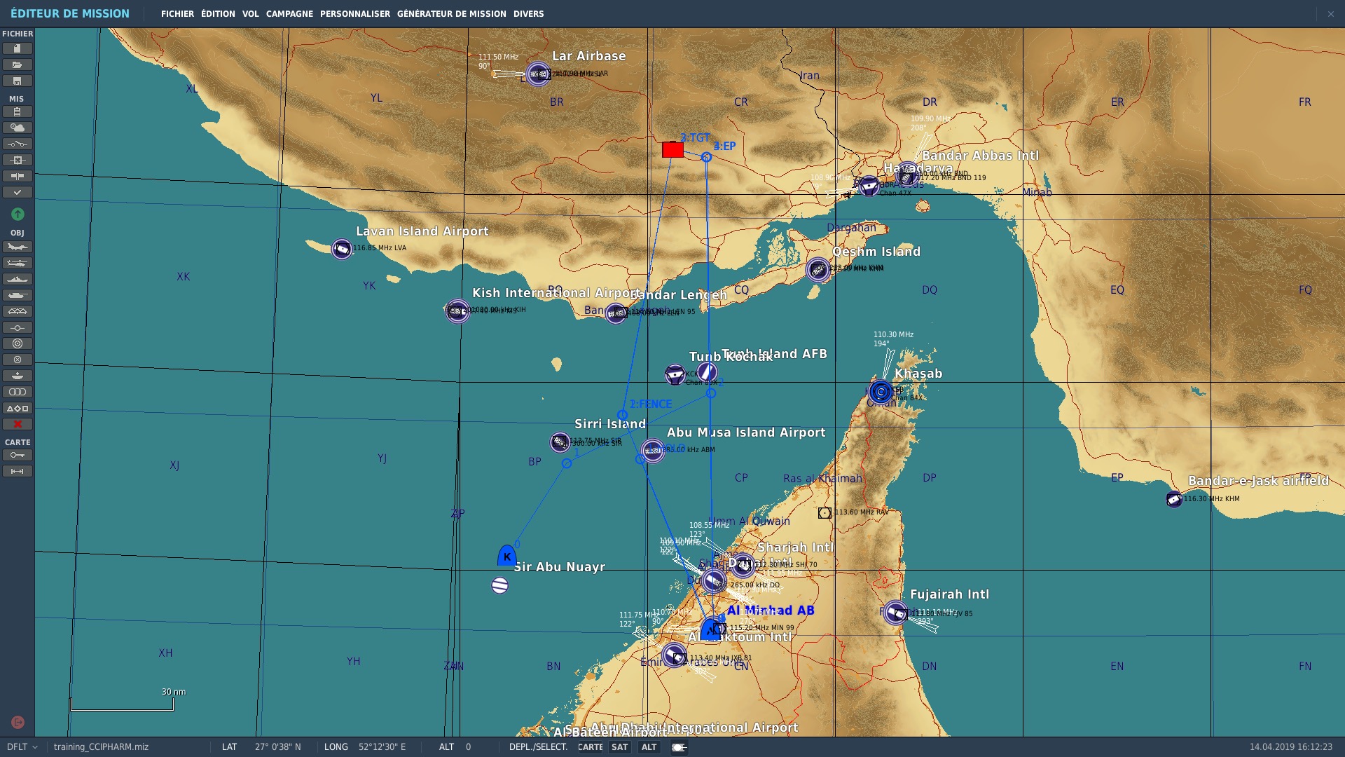Debriefing Devil Succès de la mission sans pertes a deplorer Bon respect des consignes d'évolution en NAV et gestion carburant, la mission s'est très bien déroulée malgré sa durée (3h) et les nombreux pièges possibles liés a la météo. Donc je pense qu'il n'y a pas a rougir de la prestation. Le point majeur a améliorer vient de la partie leadership dont j'ai été responsable, a savoir acquérir une meilleure connaissance des différentes portées d'emission radar et des decisions a prendre en conséquence. Je me suis retrouvé exposé vertical SA-8 faute d'une vision précise de son emplacement, la triangulation ayant échoué car le site SAM est apparu dans nos 9h a tous les 3 malgré la disposition de la formation. Une fois la menace détecté et la manœuvre d'ingress effectuée j'ai tiré un AGM-88 pensant ma cible devant alors qu'en fait je m'apprêtais a passer vertical de celle ci, le missile est donc parti sur la tete d'un berger iranien. Solutions envisageables: