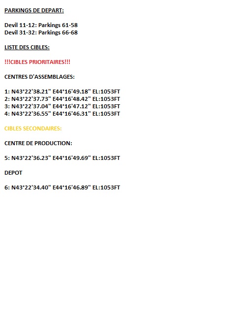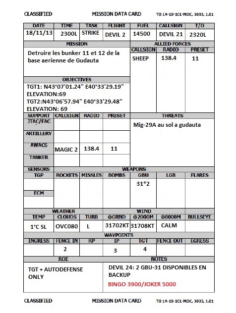Debriefing Devils Que dire si ce n'est qu'on est passé a coté de notre vol et que cetait un soir sans. Difficile de faire un debrief productif, Les manquements sont nombreux et évidents: Manque de coordination, de communication, de reaction (évasives), on s'est retrouvé pris de court a 3vs2 et on a pas su profiter de cet avantage en fonçant tete baissé 1 par 1 se faire cueillir par les SU-30, qu'on a pourtant bien vu venir malgré l'absence d'awacs. Bilan: Tout le A/A est a travailler en partant de la base, c'est clairement notre gros point faible Voila je pense que de faire un debrief detaillé n'est pas utile et que la seule solution est de mettre en place un entrainement progressif dans ce domaine d'emploi quand le calendrier le permettra Merci aux personnes présente pour leur participation Tacview --------------------