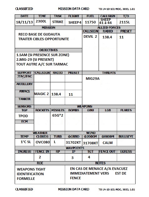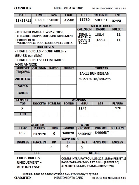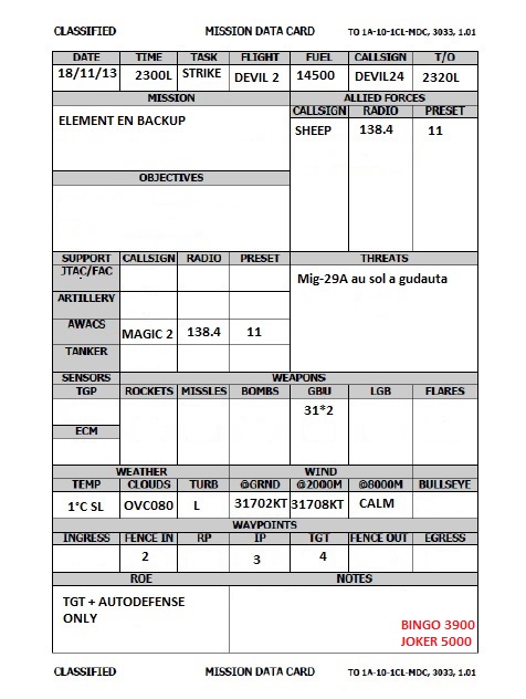 Dernière mission de la campagne de Moos "Operation Desert Weasel". Le 4th MEG participe avec 3 appareils de la VMA-214. Sheep 51 Tiengo Sheep 52 Oxi Sheep 53 Bruno Cibles: 2 zones en AI à l'est de la map sur PG (Armor C et D) Coordonnées données au brief. Le brief est clair on part bon dernier après les différents packages. Du coup on prend notre temps pour rentrer les coordonnées, les codes laser, préparer les jvn, et attendre Bruno qui a fait la Maj du jour et doit donc revenir en arrière. Un très grand plaisir de participer de nouveau à une belle Comao avec un contrôleur à la tour et dans l'awacs. Merci John! Décollage sans encombre, le soleil se couche très rapidement et on arrive de nuit sur le Tanker. Comms impossible avec lui, le panier qui se déconnecte tout seul, bref seul 53 peut prendre du carburant, le tout en condition lumineuse précaire et moi même qui n'arrive pas a mettre les JVN (une histoire de gauche et de droite toussa quoi). Le faible carburant ne permettra pas à 51 et 52 de rester sur zone très longtemps. Les passes s'enchainent mais les consignes de tiengo n'ont pas été comprise par 2 et 3 (une histoire de gauche et de droite *BIS*+ géographie est/ouest). Bingo annoncé pour leader et 2, on décide d'aller se poser sur Khasab. Enfin tiengo se dit que le bingo est là pour faire joli, il finira par se poser avec 100 livres de carburant. Tout le monde sera rentré sur Khasab pour la fin de mission. Au final un peu plus d'une dizaine de cible sur Armor D sera traité. Retex: -Respecter le bingo!!! Si on le met c'est qu'il sert à quelque chose. -Circuit d'attaque non respecté (Comm non comprise?) -Se ré-entraîner au vol de nuit avec les procédures. > lundi -Rappeler au chef qu'il a tord. Pistes: -Peut être continuer de donner le circuit d'attaque en beta/delta plutôt qu'en Est Ouest histoire d'être sûr de ne pas se tromper. -Training RVT pour rester le moins de temps possible au cul du tanker. -Training de nuit et réviser mappage de touche voir utiliser voice attack. --------------------