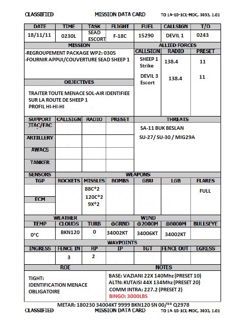 Après ces qqes mois apres avoir commencé à dompter nos montures, le vol d'hier, qui s'est effectué dans le cadre d'une mission, a permis de recueillir qqes éléments de debriefing pertinents: - La communication sur la fréquence commune doit être renforcée, notamment lors de l'absence d'un contrôleur, les phases importantes de la mission sont à annoncer pour permettre à tous de suivre (tirs, attaque, push sur ravito) - Pour la phase du SEAD, le mode TOO est trés utile pour situer une menace sur le HUD, cela permet de s'assurer du positionement de la menace en territoire hostile (ou non) - Attribuer une touche pour éviter de passer en PC sur 18 est trés utile pour eviter de trop consommer (mission de 2 heures avec 1 seul ravito sans bidon externe possible) - Qqes freezes TACAN constatés, faire un ON/OFF avant ralliement pour etre sûr qu'il n'y a pas de bug. J'ai surement oublié des trucs, n'hesitez pas à completer !! --------------------