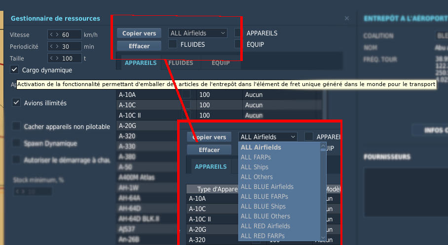 Coucou, une demande pour ajouter une fonctionnalité dans les templates. - Ajout de la fonction "Cargo dynamique" pour tout les aerodromes et navires de la carte. Cela pourrait permettre des scenarios a base de transports d'un aerodrome plein a un aerodrome vide. Option qui peut être vite oublié mais facile a ajouter dans le template. Bref, ça se trouve dans les ressources de l'aeroport, une case à cocher, et ensuite copier sur tout les terrains et tout les navires. Salut Oxi, c'est noté dans la todo. --------------------
